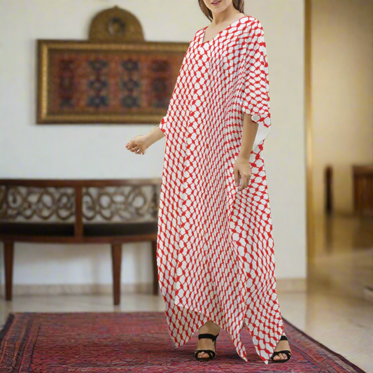 Red Kuffiyeh Print Women's Imitation Silk V-neck Kaftan Robe