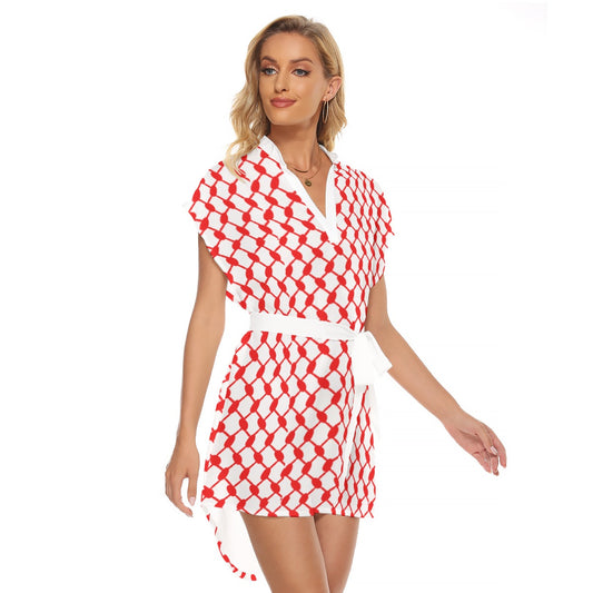 Red Kuffiyeh Jordanian Print Women's Stand-up Collar Casual blouse With Belt
