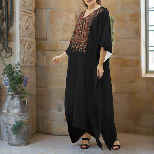 Palestinian Tatreez Print Women's Imitation Silk V-neck Kaftan Robe