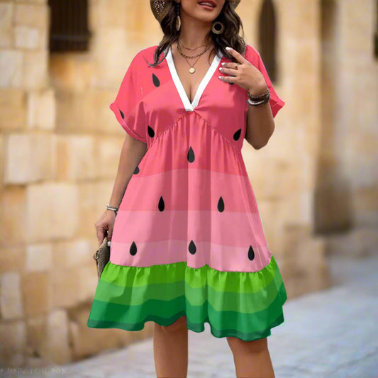 Watermelon All-Over Print Women’s Floral V-Neck Short Sleeve Dress