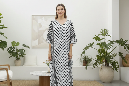 Our Keffiyeh / Kuffiyeh print designs are reimagined in a fashion-forward way, combining traditional motifs with modern silhouettes and trends. Whether you're looking for a bold printed dress, a stylish scarf, or a unique handbag, our collection has something for everyone seeking to make a statement with their style. We believe in empowering our customers to embrace their heritage with pride, and our collection is a reflection of that commitment. With Tatreez Bazaar, you can express your cultural identity while staying effortlessly chic and fashionable.