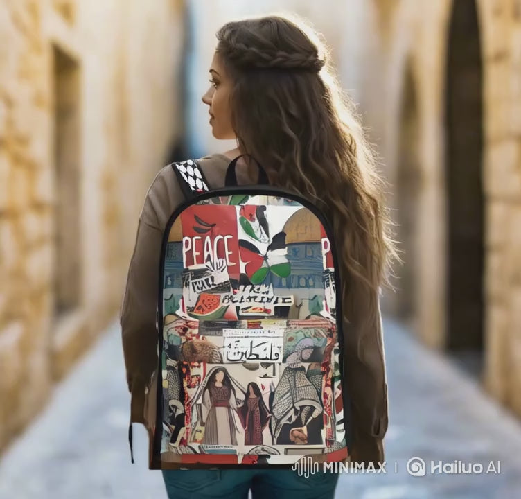 Experience a fusion of tradition and modern utility with this 17-Inch PU Leather Backpack, adorned with a stunning collage of Palestinian motifs and enhanced with Kuffiyeh-patterned shoulder straps. Designed to celebrate rich cultural heritage while offering practical everyday functionality, this backpack is a true statement piece.