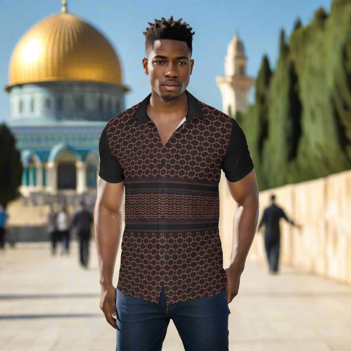Elevate your wardrobe with the Reinvented Palestinian Kuffiyeh Print Men's Shirt from Tatreez Bazaar. Embrace a blend of tradition and modernity, and make a stylish statement wherever you go