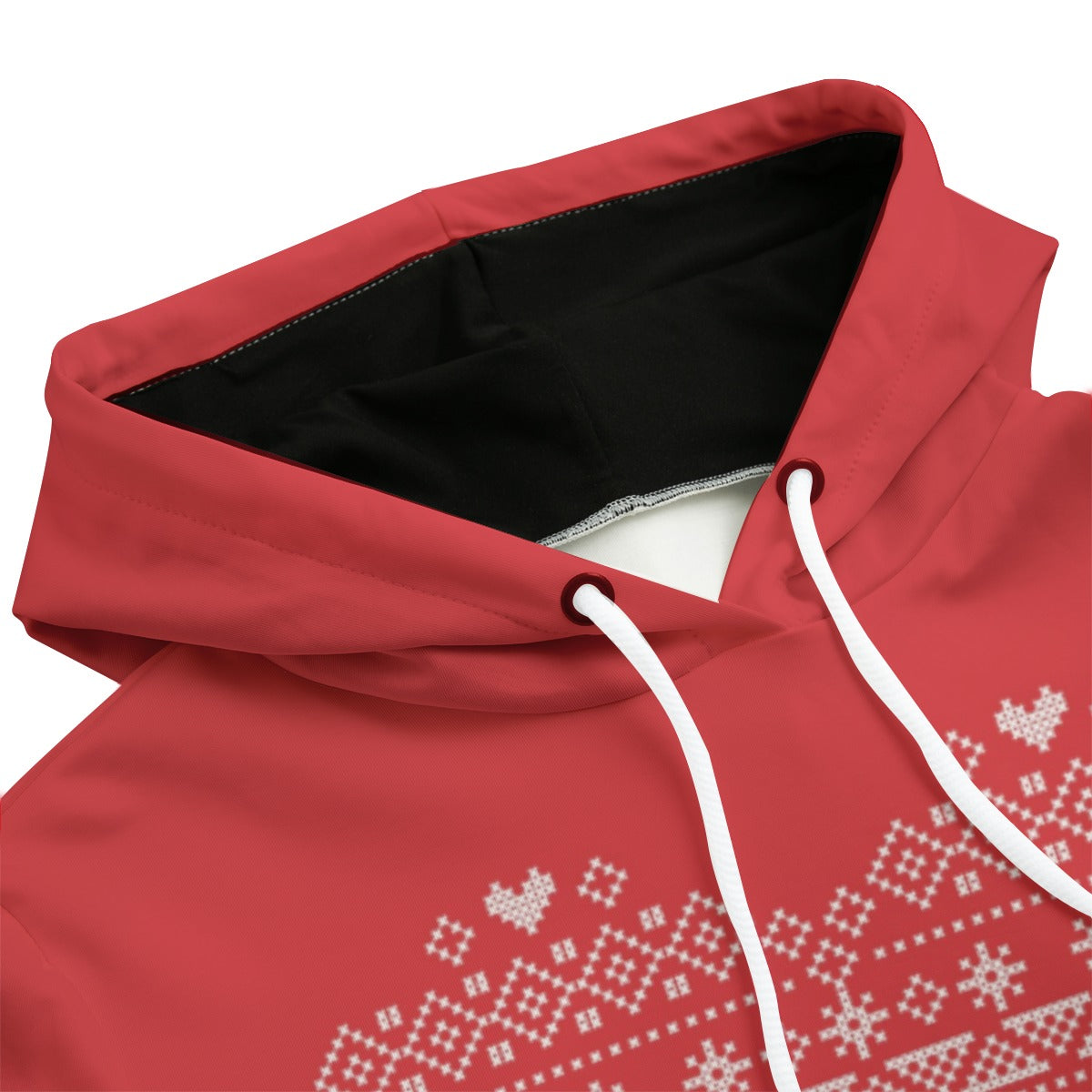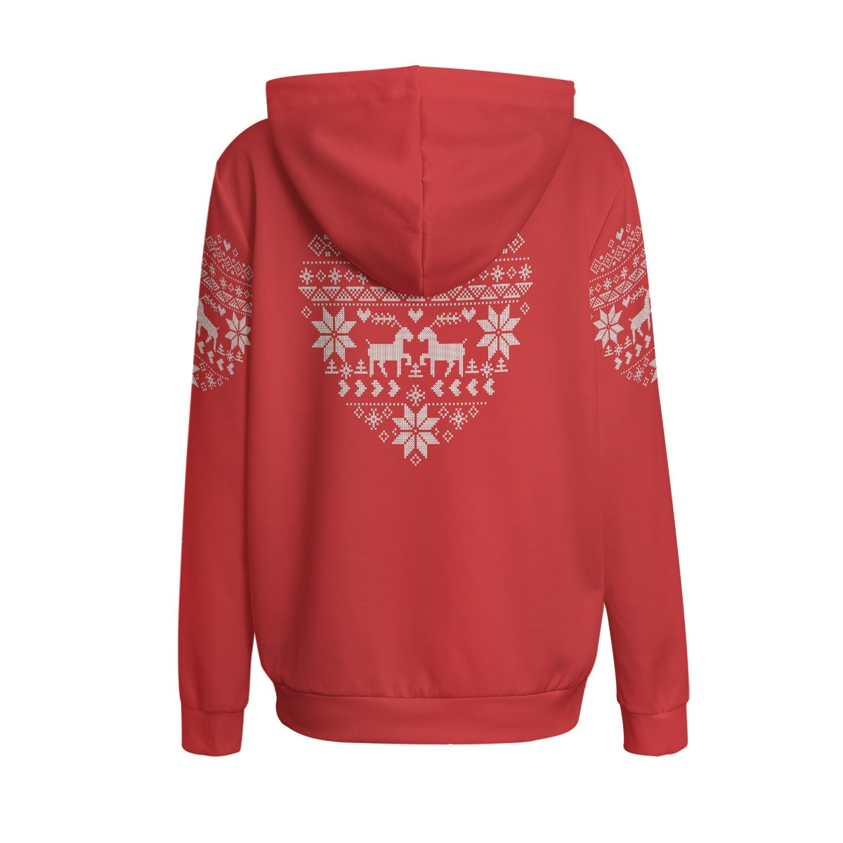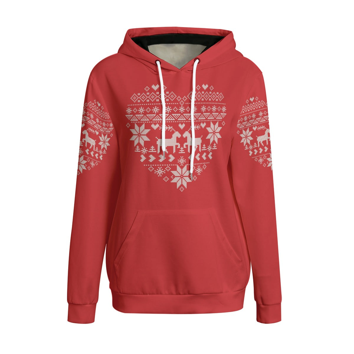 Welcome to our Women's Red Heart-shaped Tatreez Print Pullover Hoodie. This striking red hoodie, adorned with two playful reindeers, is perfect for winter and designed to keep you warm and comfortable. Its relaxed fit allows you to move freely, making it perfect for both sports and daily wear.