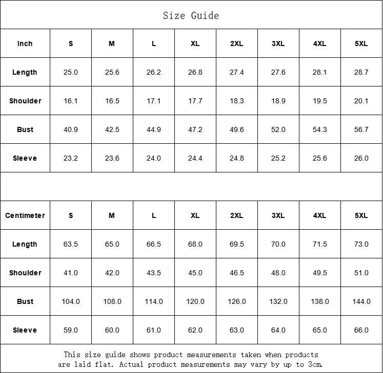 | Centimeter | S | M | L | XL | 2XL | 3XL | 4XL | 5XL |