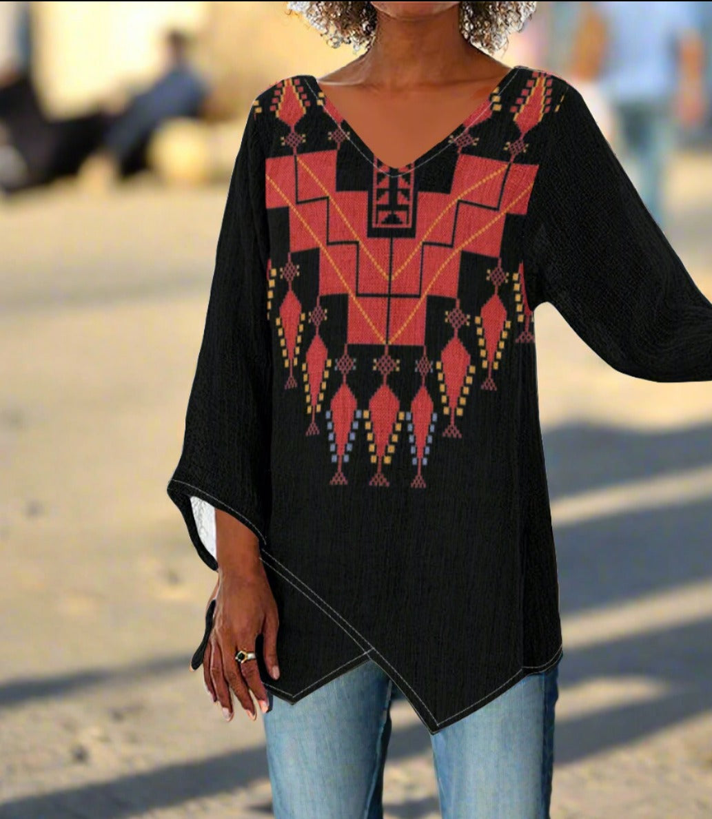 Discover the exquisite blend of tradition and modern style with our Palestinian Tatreez Gaza Design Print Women's V-neck T-shirt. Each shirt is a canvas that showcases the rich cultural heritage of Palestinian embroidery, reimagined in a print that captures the intricate beauty of Tatreez. The irregular hem adds a contemporary twist to the piece, ensuring you stand out with an effortless fashion statement.