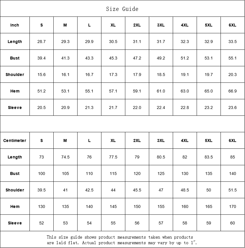 | Centimeter | S | M | L | XL | 2XL | 3XL | 4XL | 5XL | 6XL |
