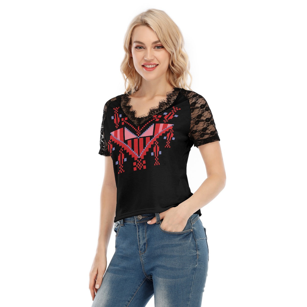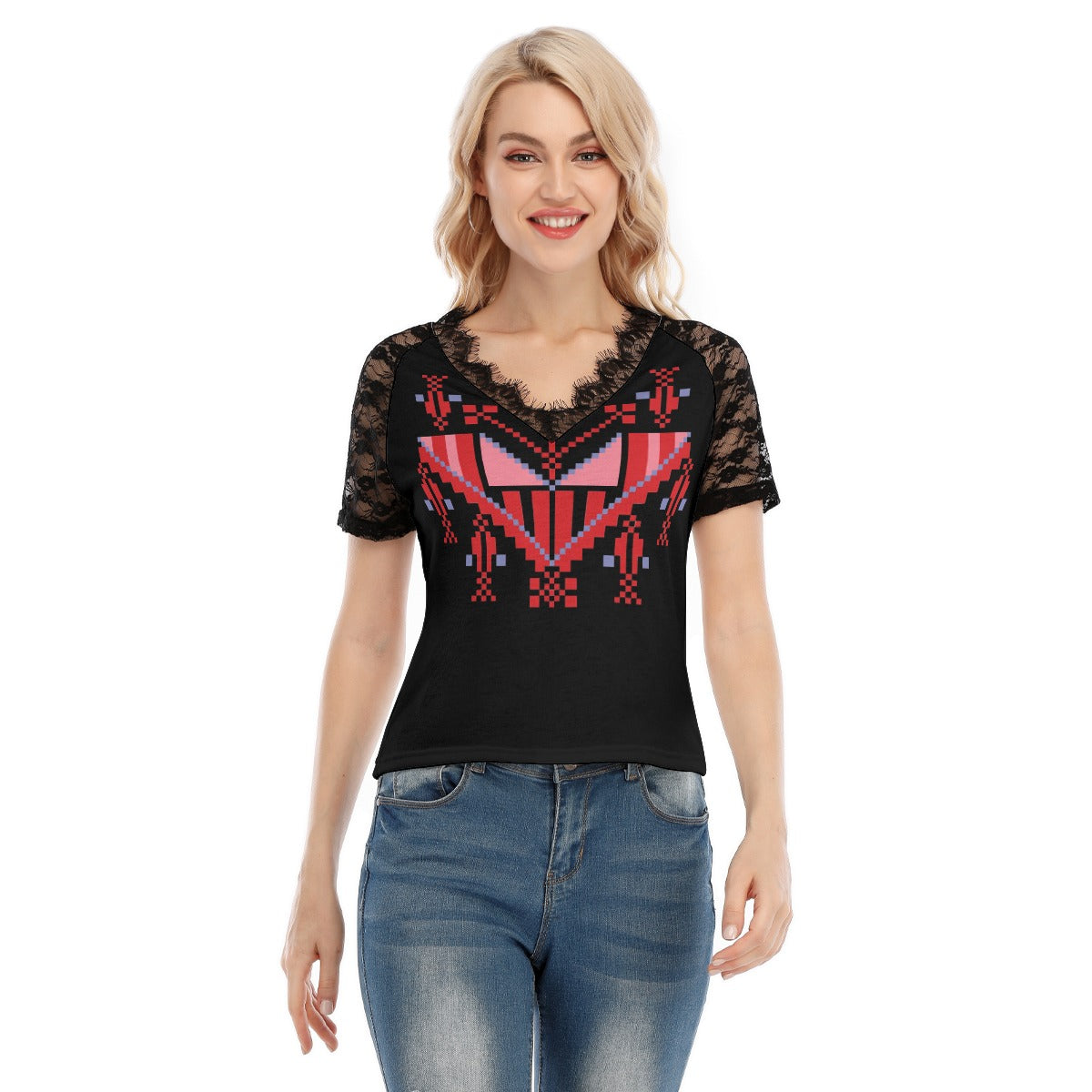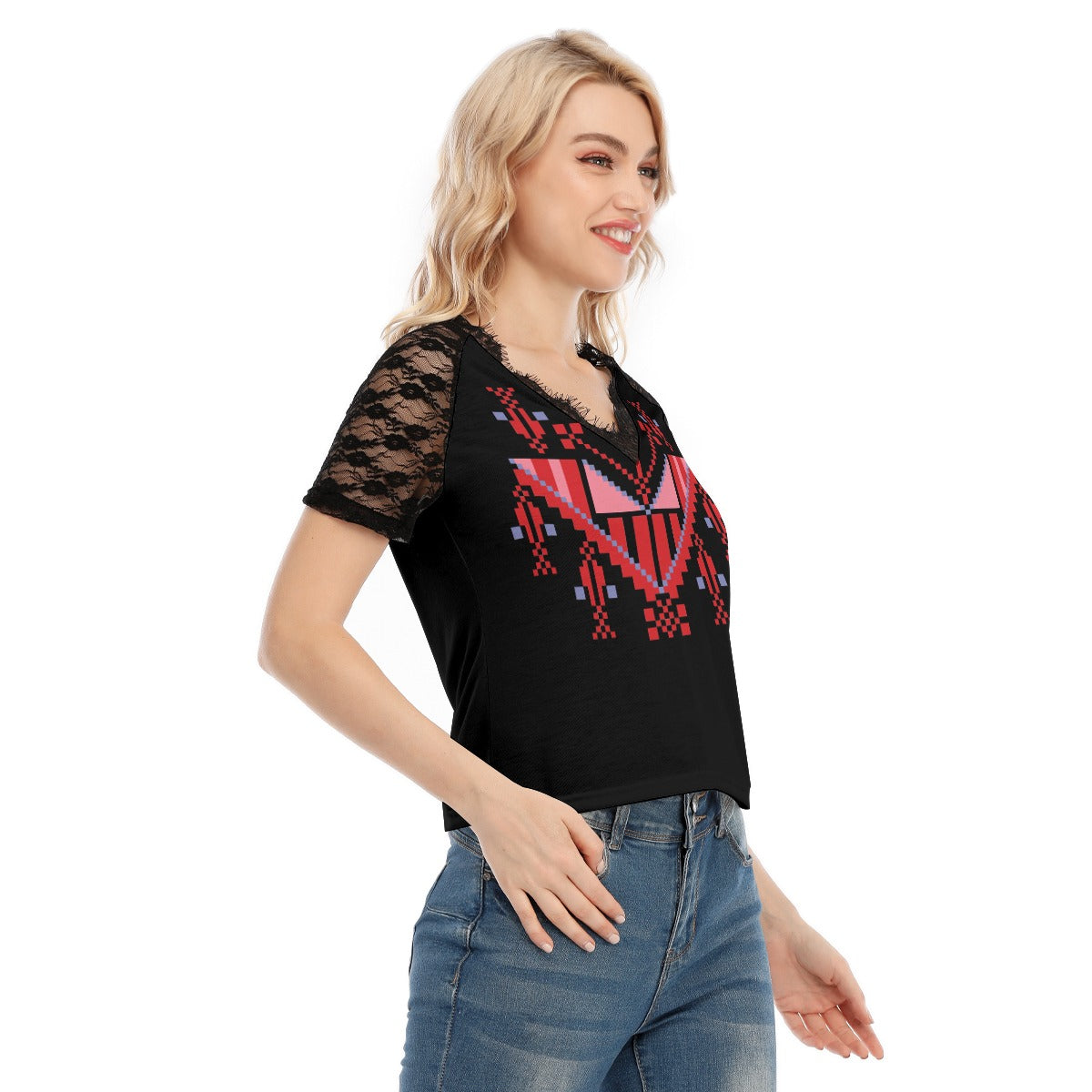 Palestinian Tatreez Print Women's V-neck T-shirt With Lace, Red