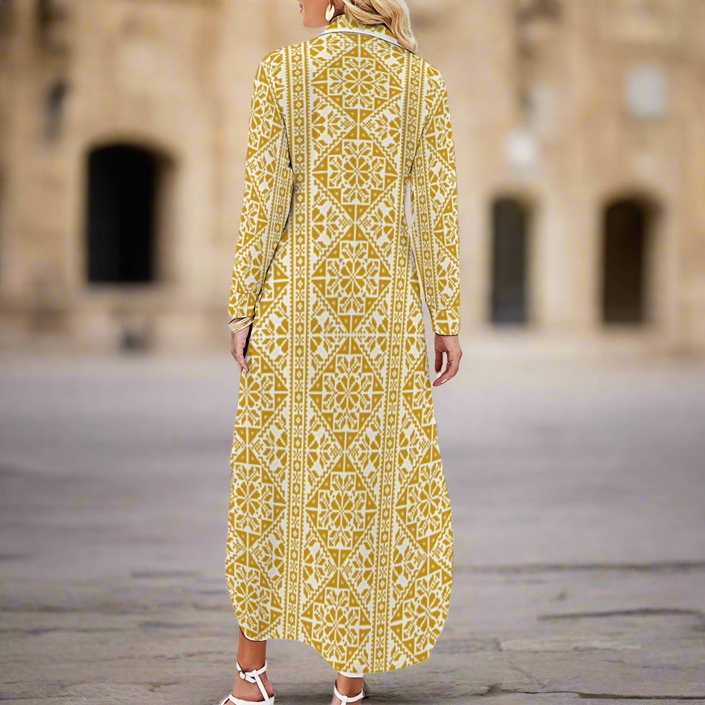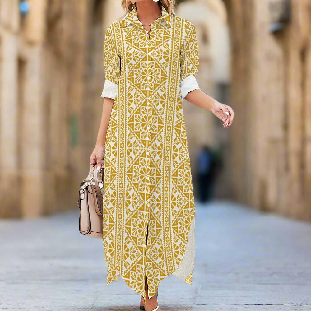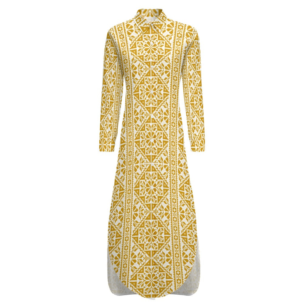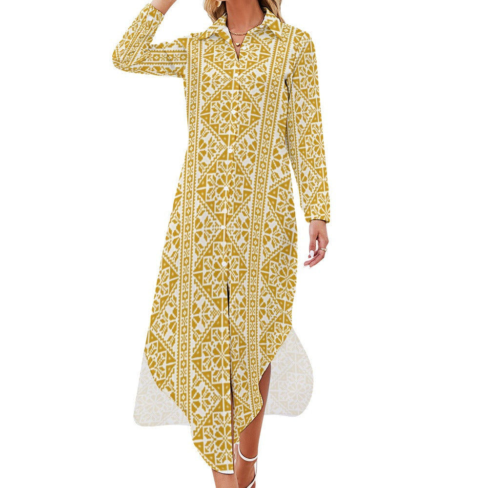 Palestinian Tatreez print Button Neck Long Sleeve Shirt Dress