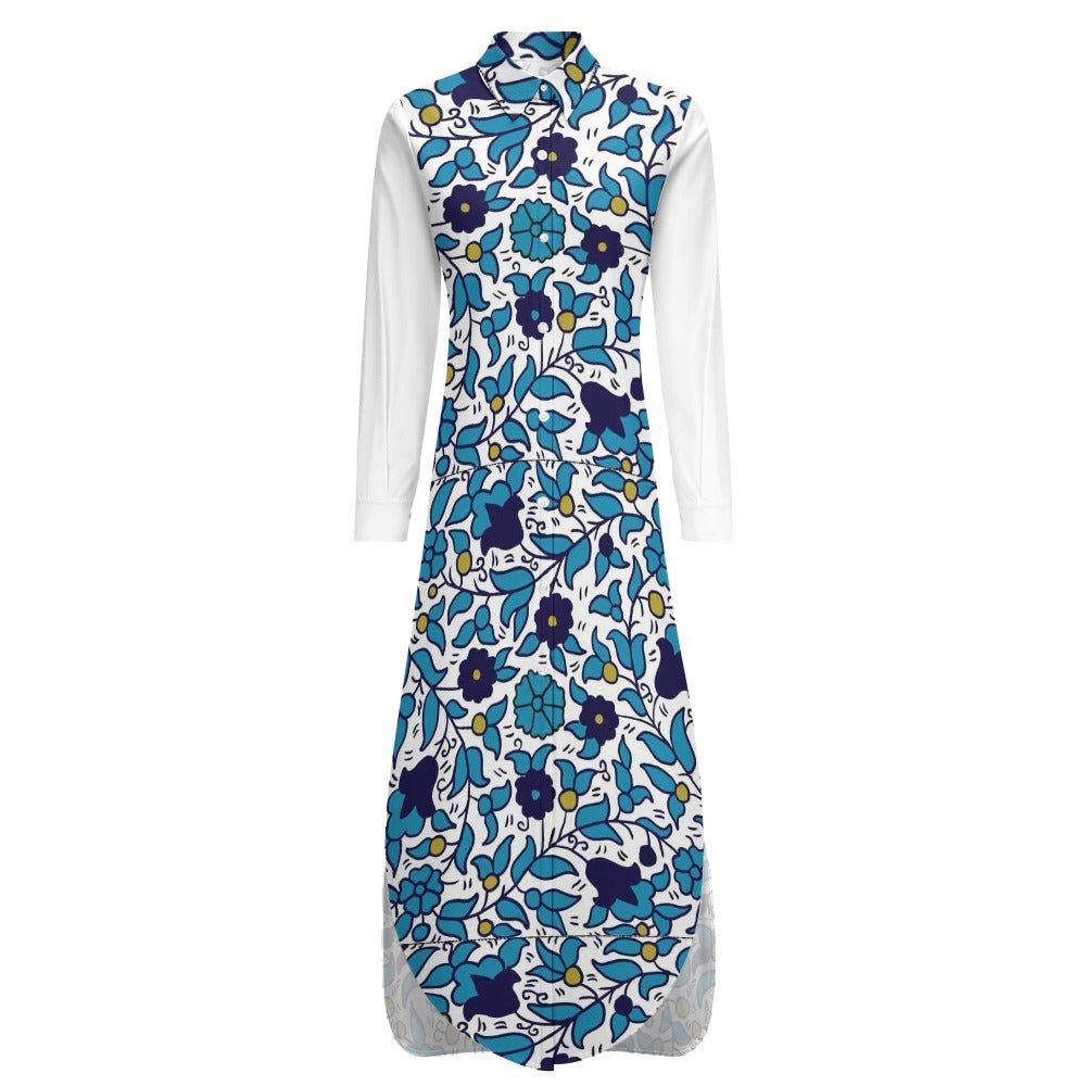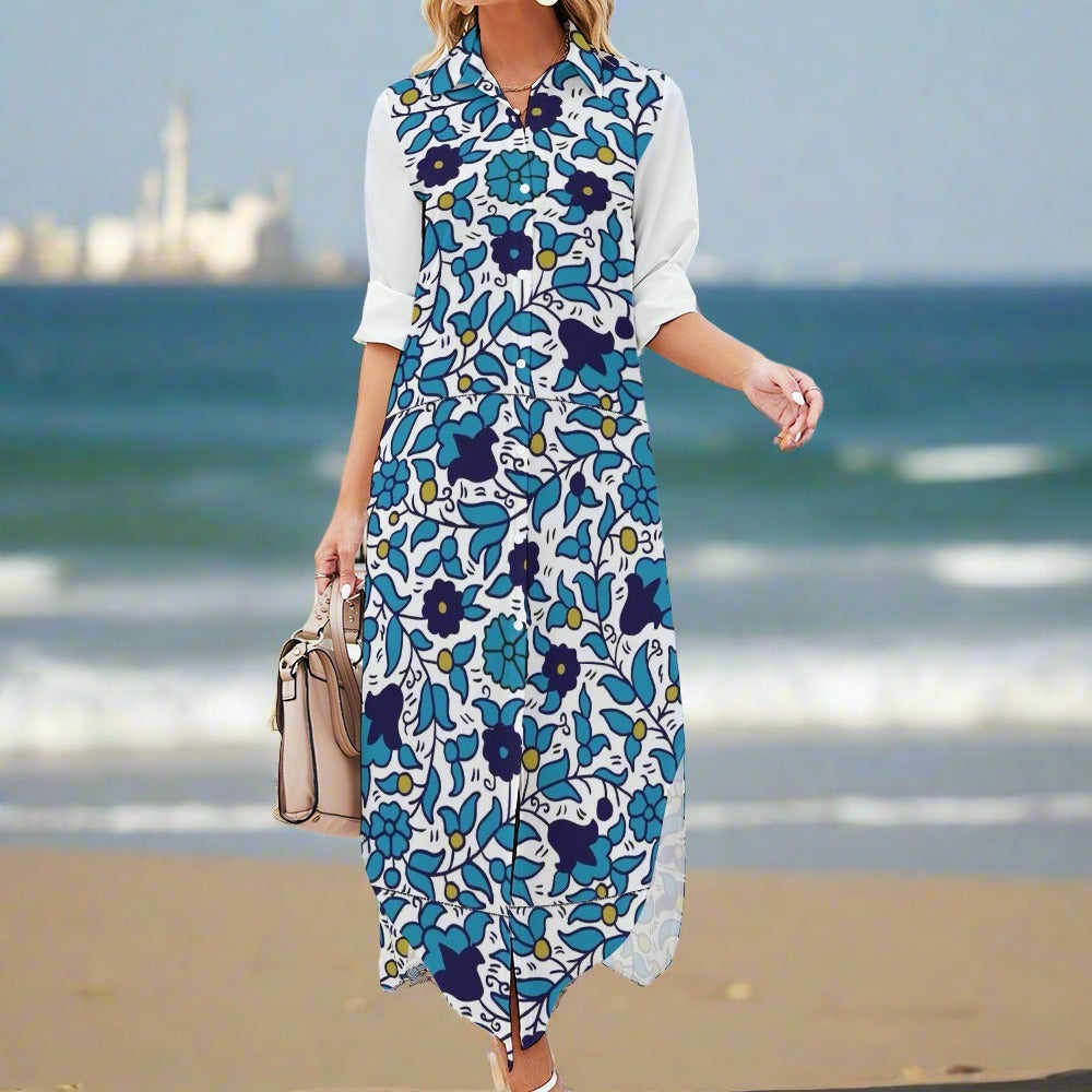 Embrace elegance and tradition with the Tatreez Bazaar Palestinian Blue Button Neck Long Sleeve Shirt Dress, featuring the beautiful Hebron Jerusalem Flower Print. This dress is a timeless piece that celebrates cultural heritage while offering contemporary style