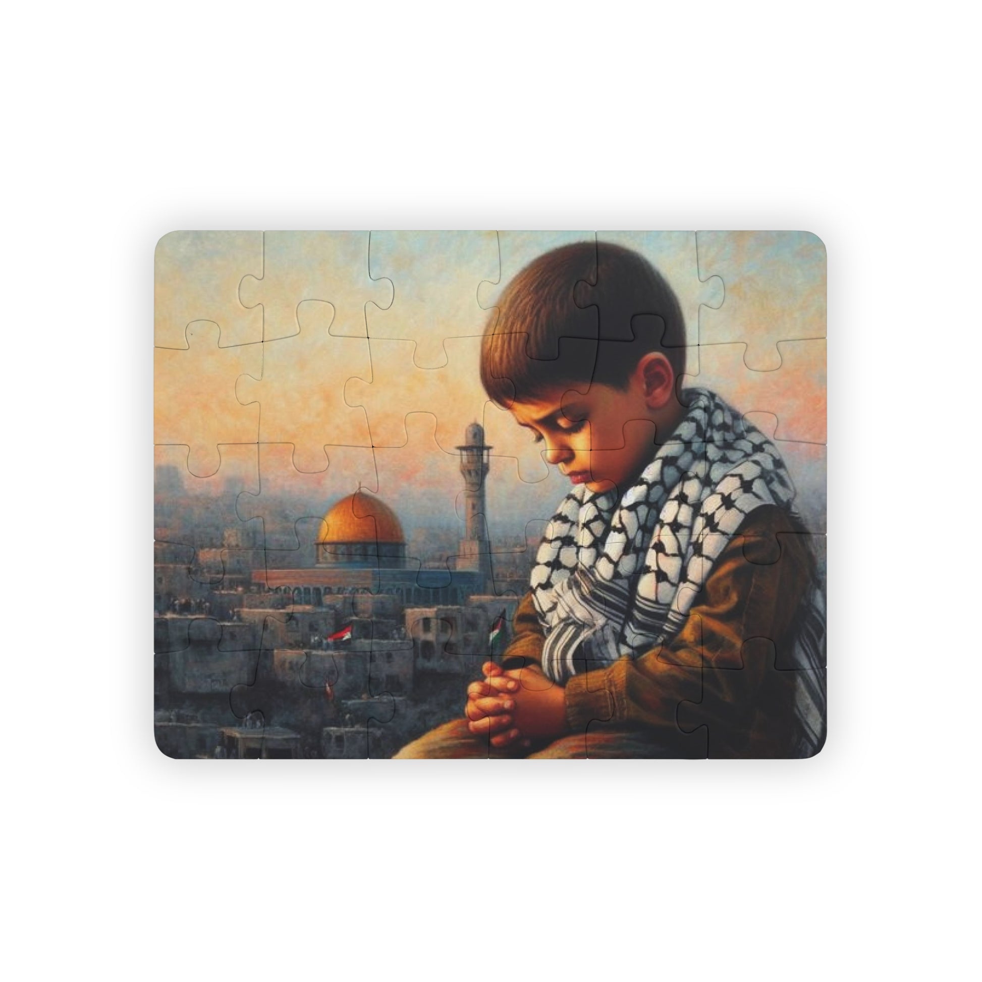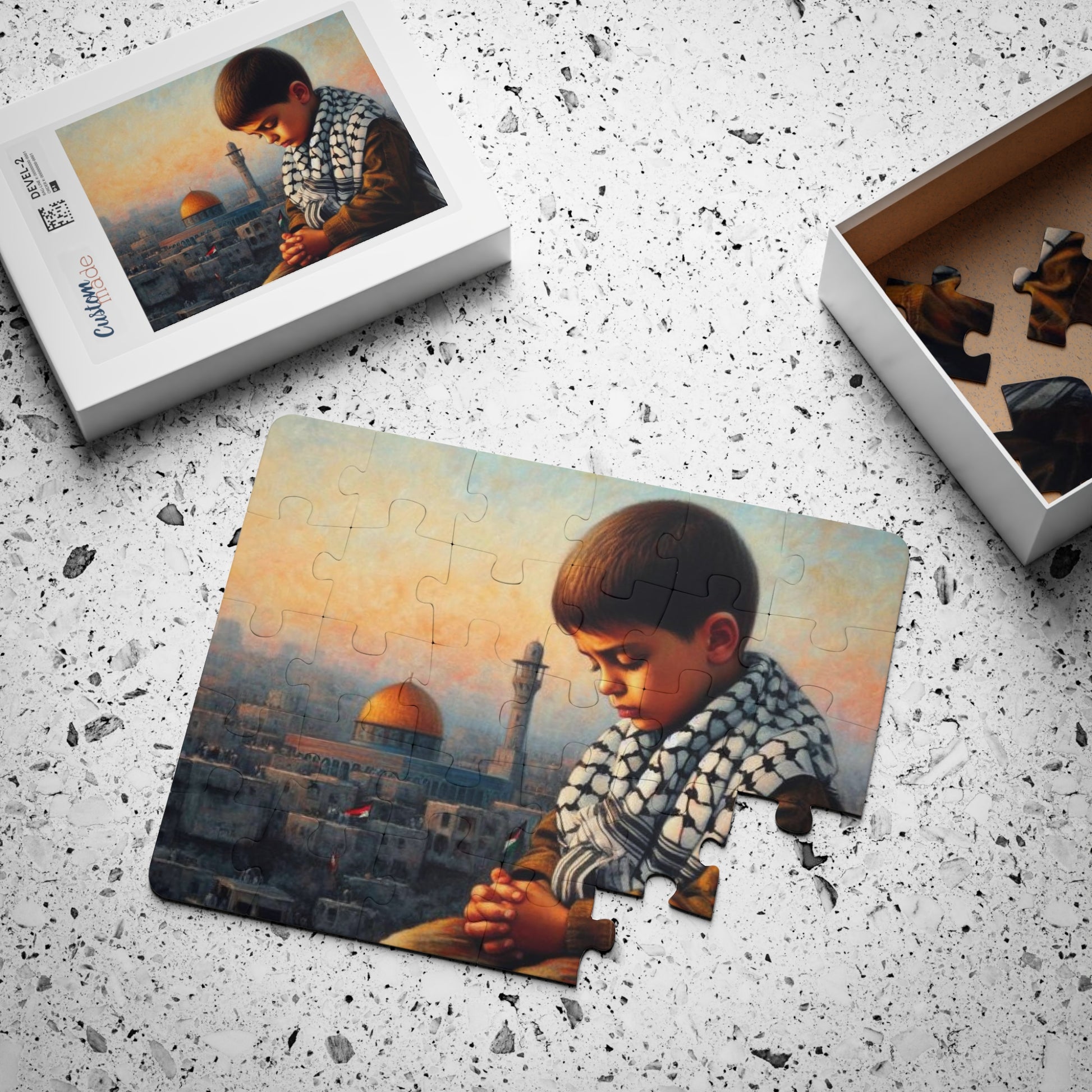 Introduce the young ones in your life to the beauty and rich heritage of Palestine with this delightful Kids' Puzzle featuring a Palestinian Boy wearing a Kufiyeh praying in Jerusalem, the eternal capital of Palestine along with the Dome of the Rock, and Jerusalem in the background. This unique and educational puzzle is not just a fun activity but also a meaningful way to connect children to their cultural roots, making it an ideal gift for Palestinian children.