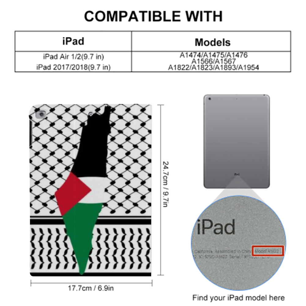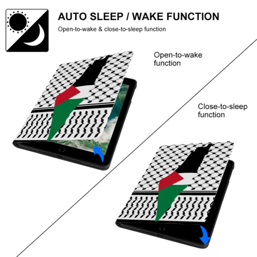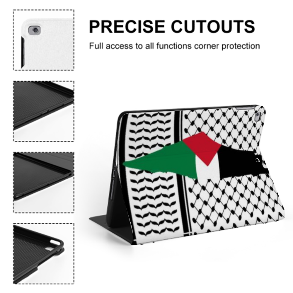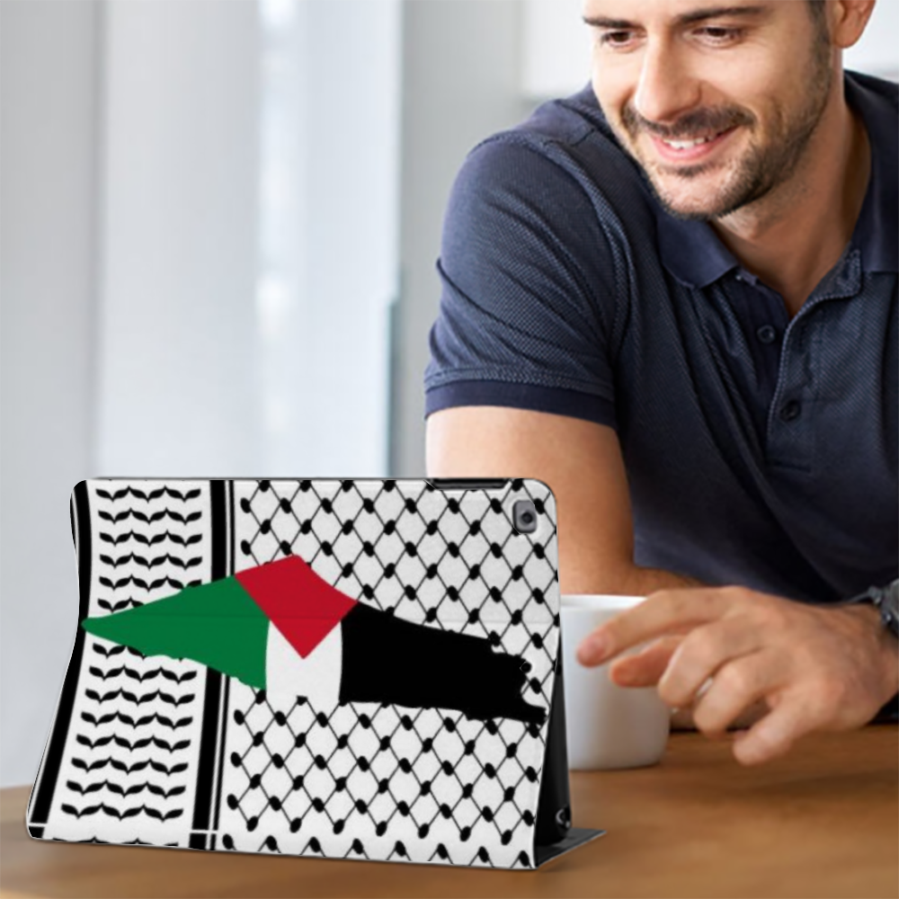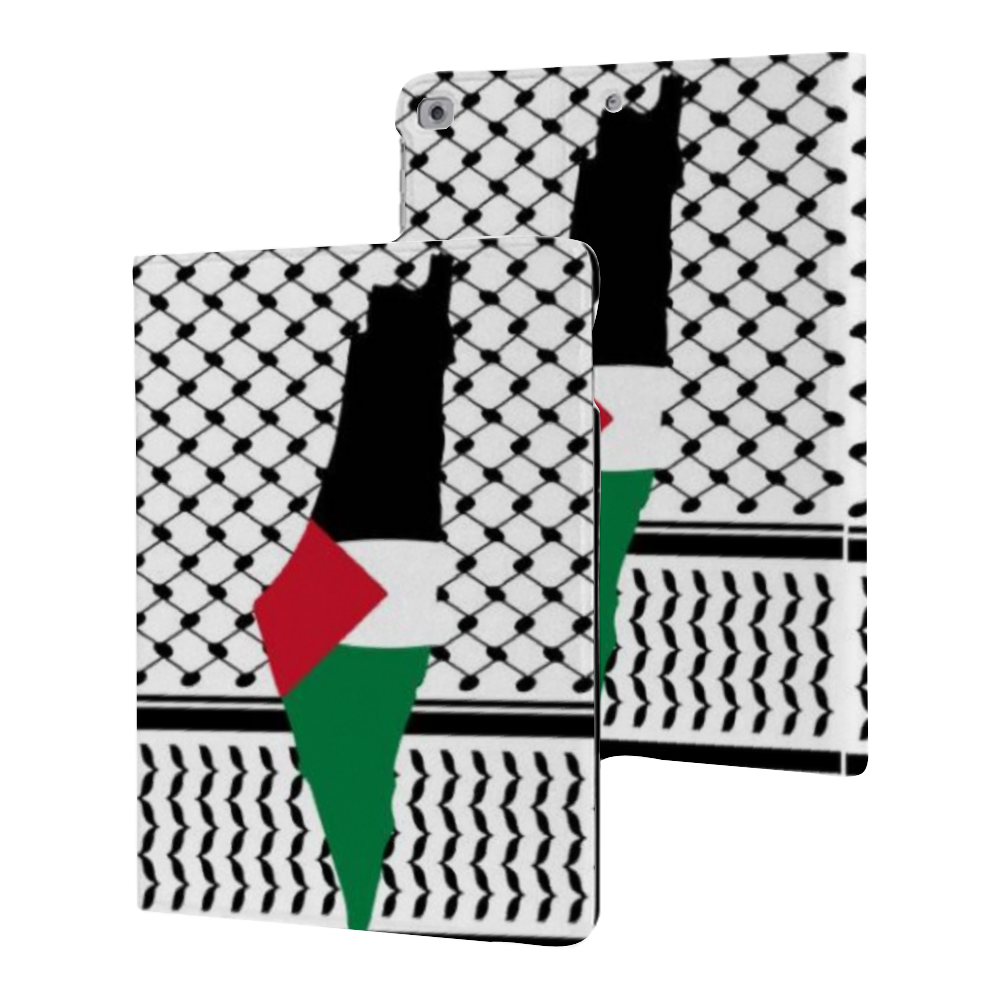 Featuring single-sided UV printing, the intricate Palestinian Kuffiyeh and Palestinian Map design adorns the cover, adding a touch of tradition and heritage to your modern device. Whether at work, home, or on the go, this case offers versatility, allowing you to protect your iPad while watching videos, attending meetings, or simply carrying it around. Suitable for a Wide Range of Models Ultra-thin and Lightweight Book Style Cover iPad case.