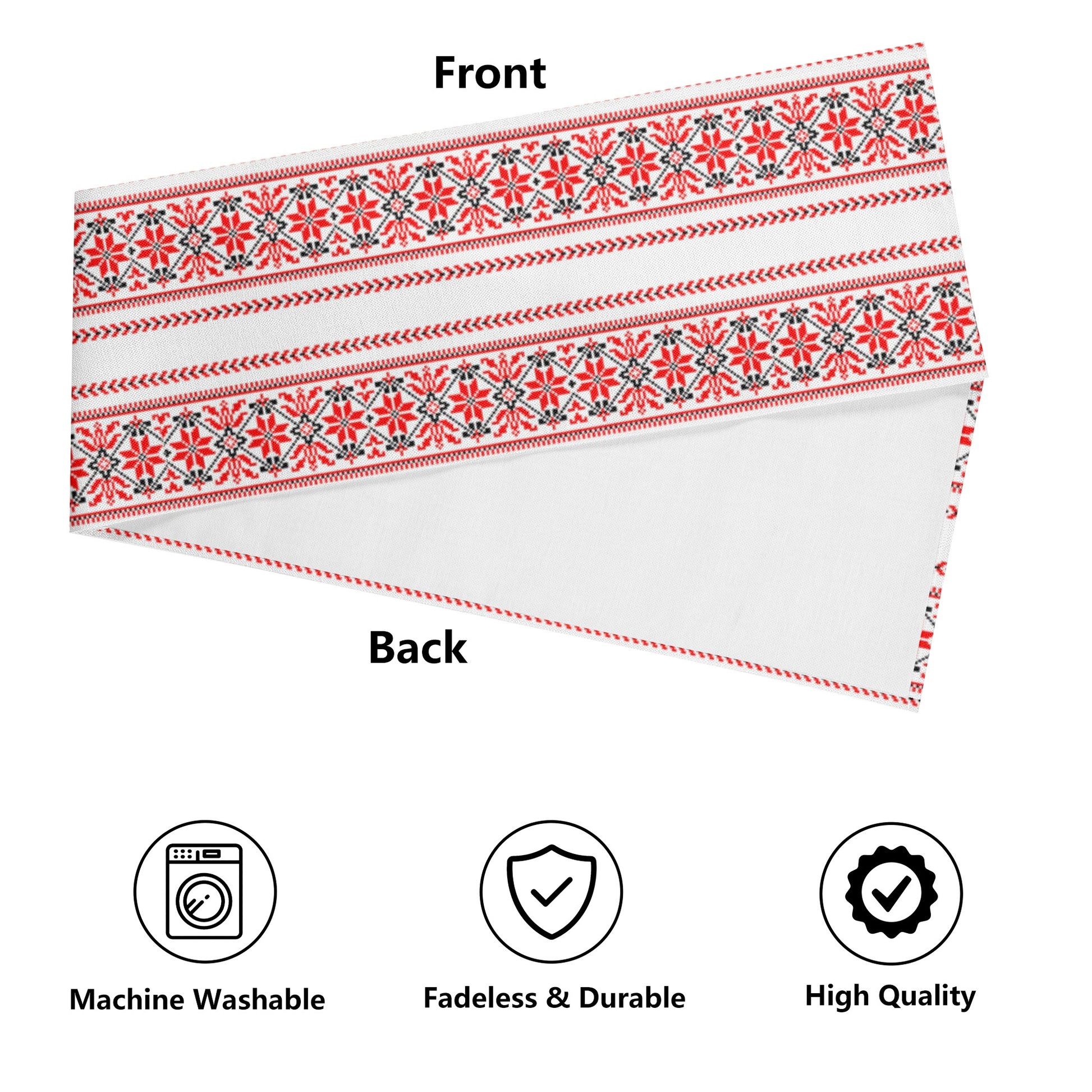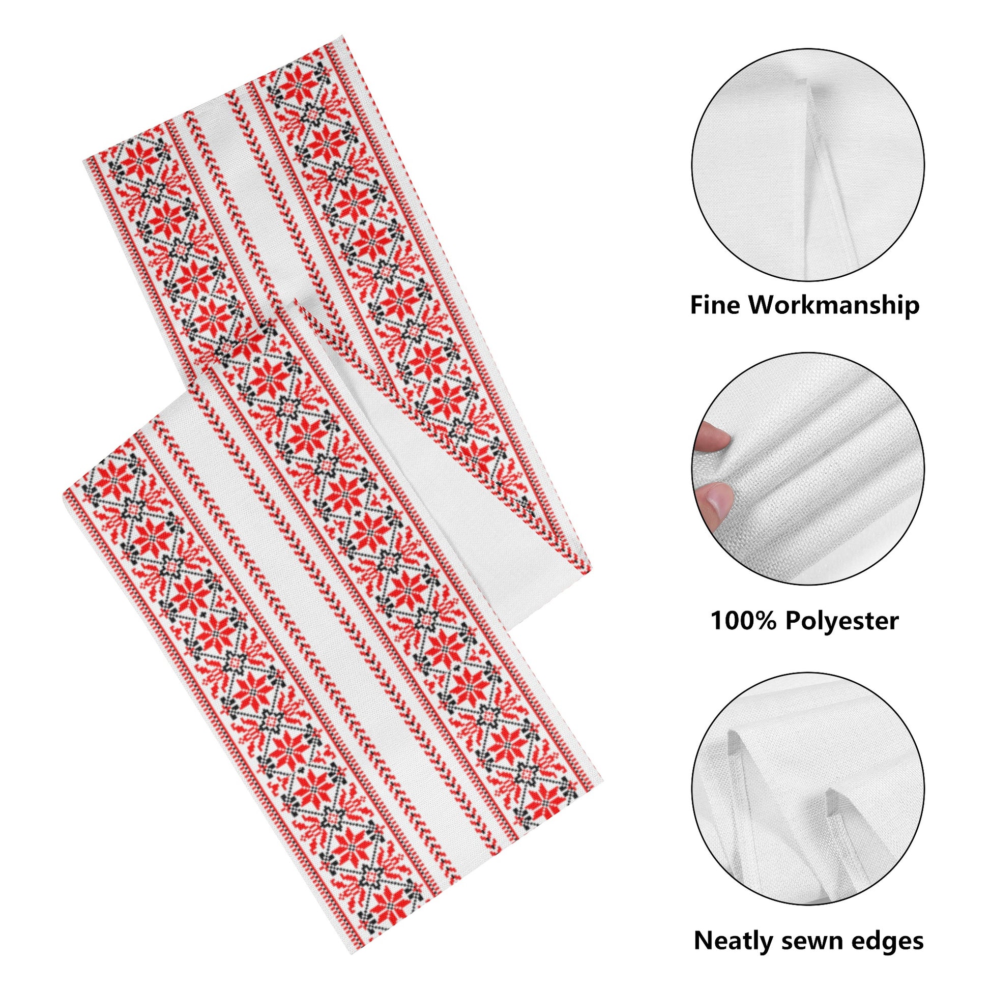 Step into the world of traditional Middle Eastern artistry with our Palestinian print table runner. Beautifully crafted from durable polyester material, this runner boasts a striking all-over print design, adding a touch of cultural heritage to your home decor. The table runner measures 13 X 72 inches, making it the perfect size for most standard tables. Its rectangular flat design allows it to lay perfectly on any surface, creating an inviting and warm atmosphere in your dining area, living room, or wherever you choose to place it.