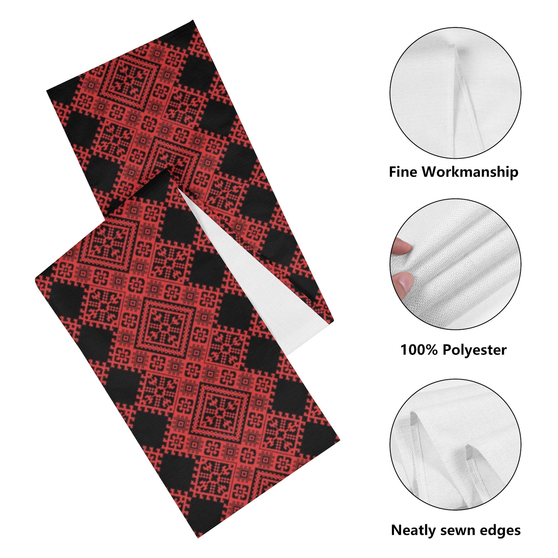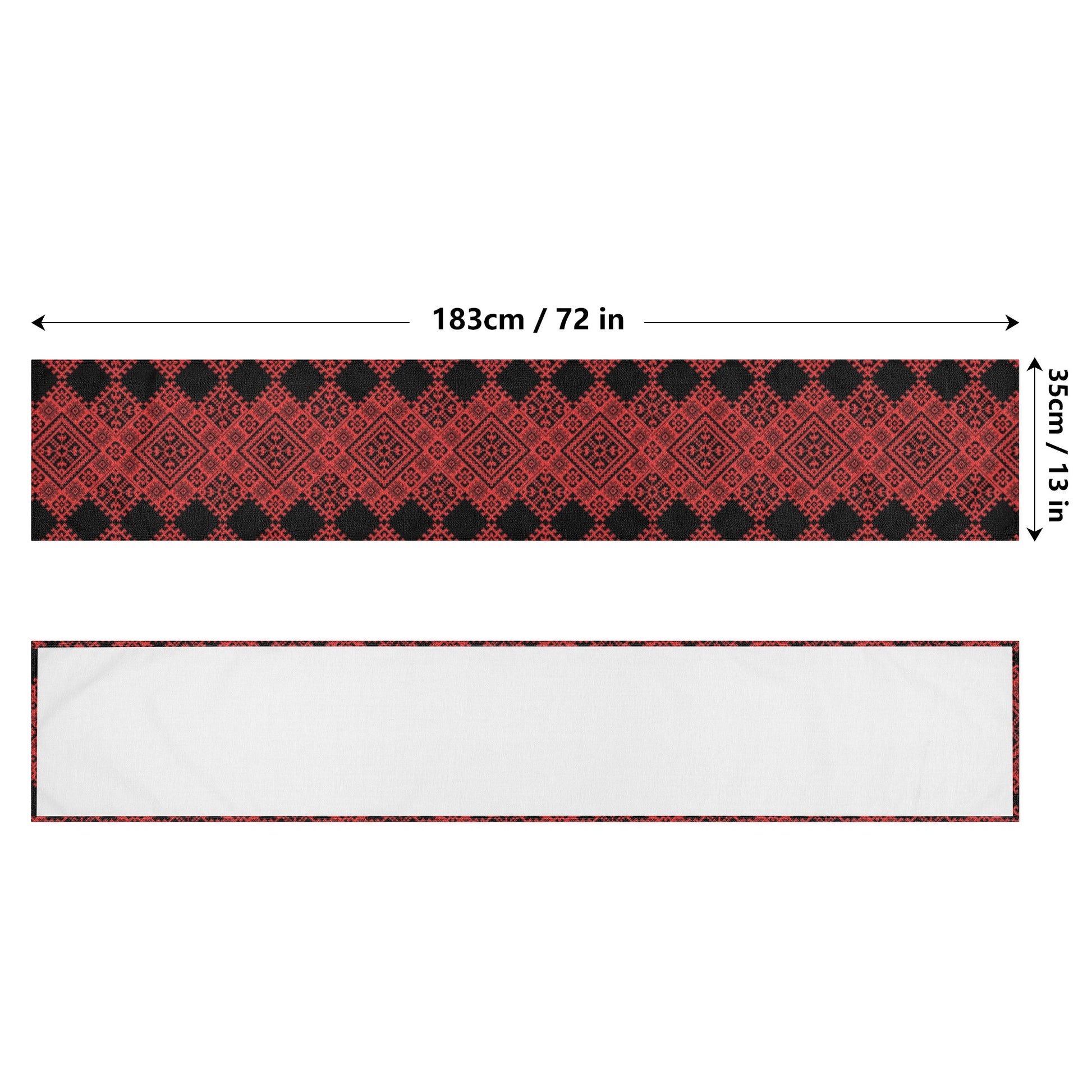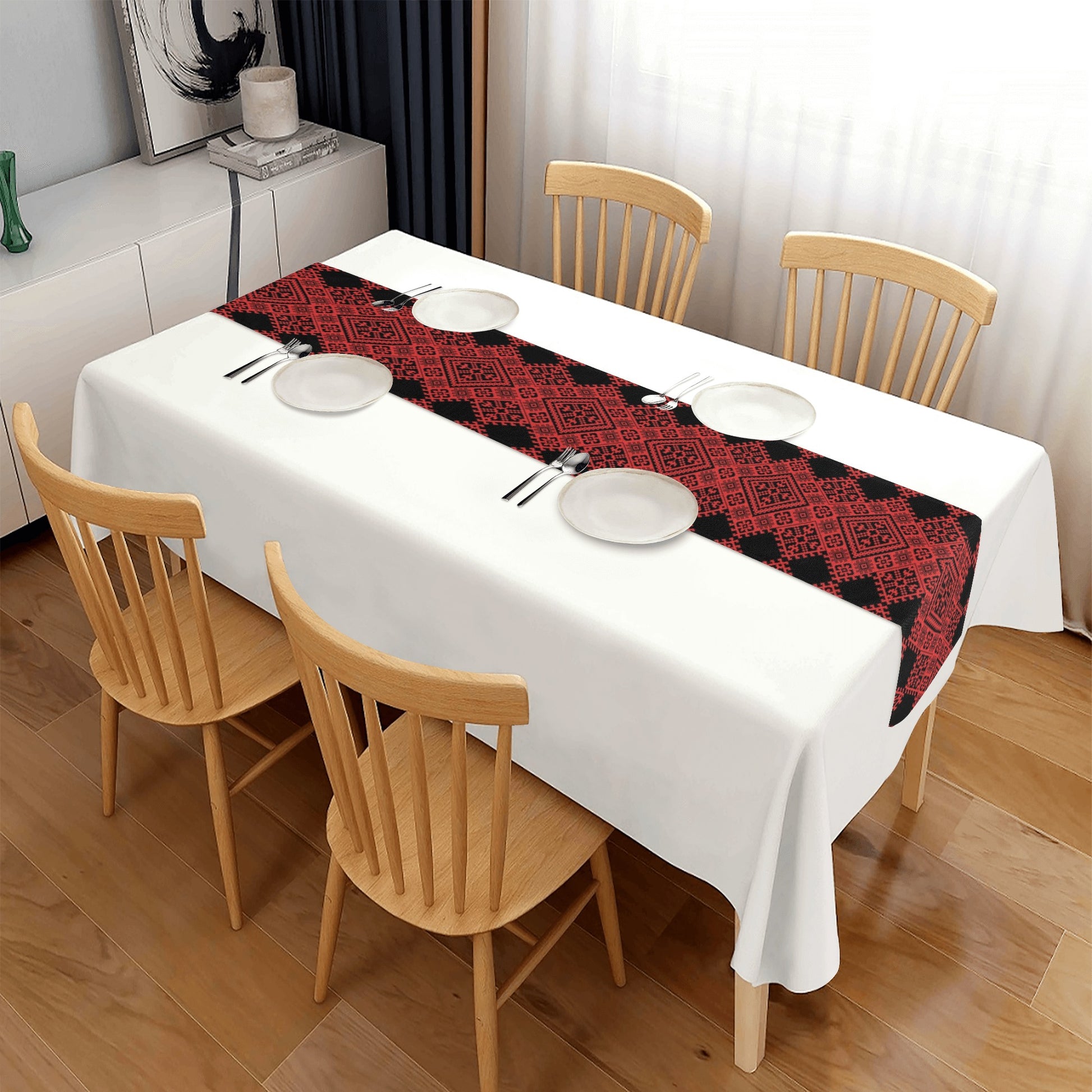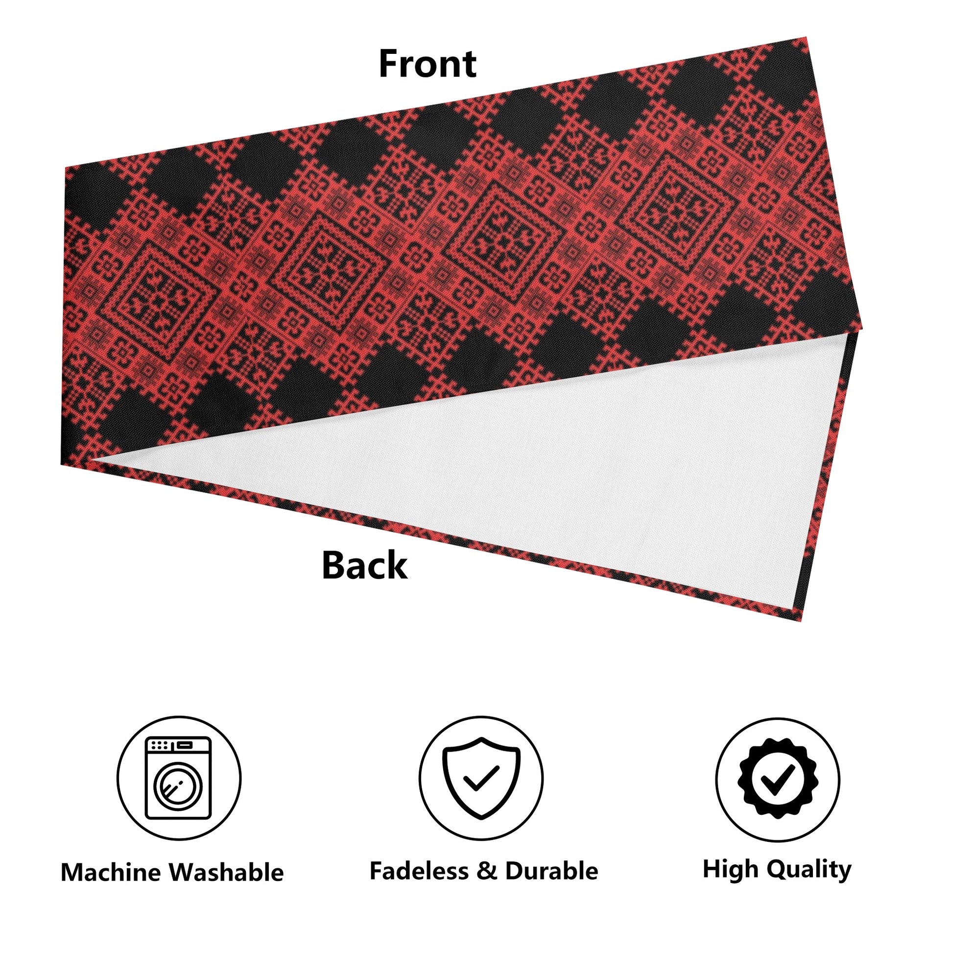 Step into the world of traditional Middle Eastern artistry with our Palestinian print table runner. Beautifully crafted from durable polyester material, this runner boasts a striking all-over print design, adding a touch of cultural heritage to your home decor. The table runner measures 13 X 72 inches, making it the perfect size for most standard tables. Its rectangular flat design allows it to lay perfectly on any surface, creating an inviting and warm atmosphere in your dining area, living room, or wherever you choose to place it.