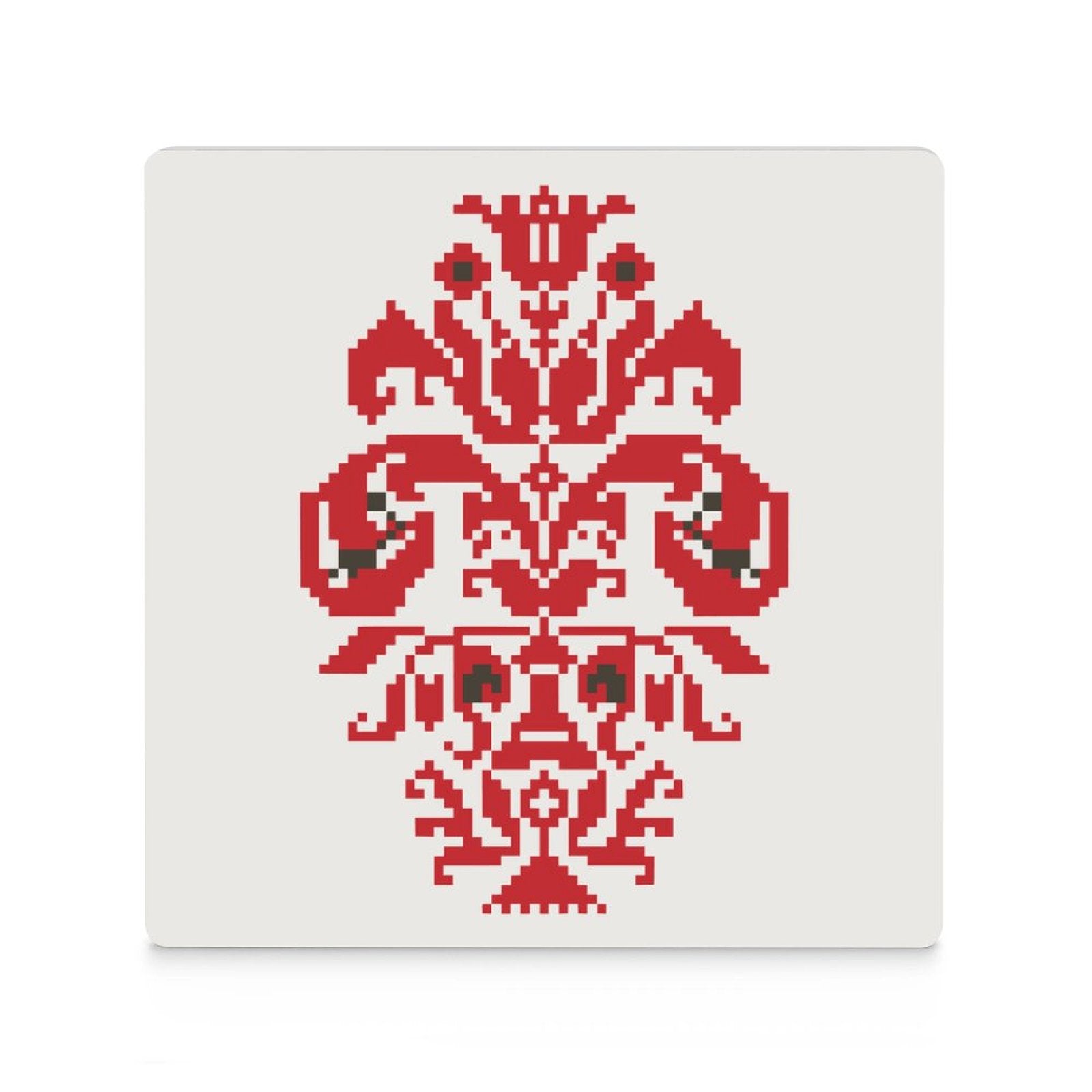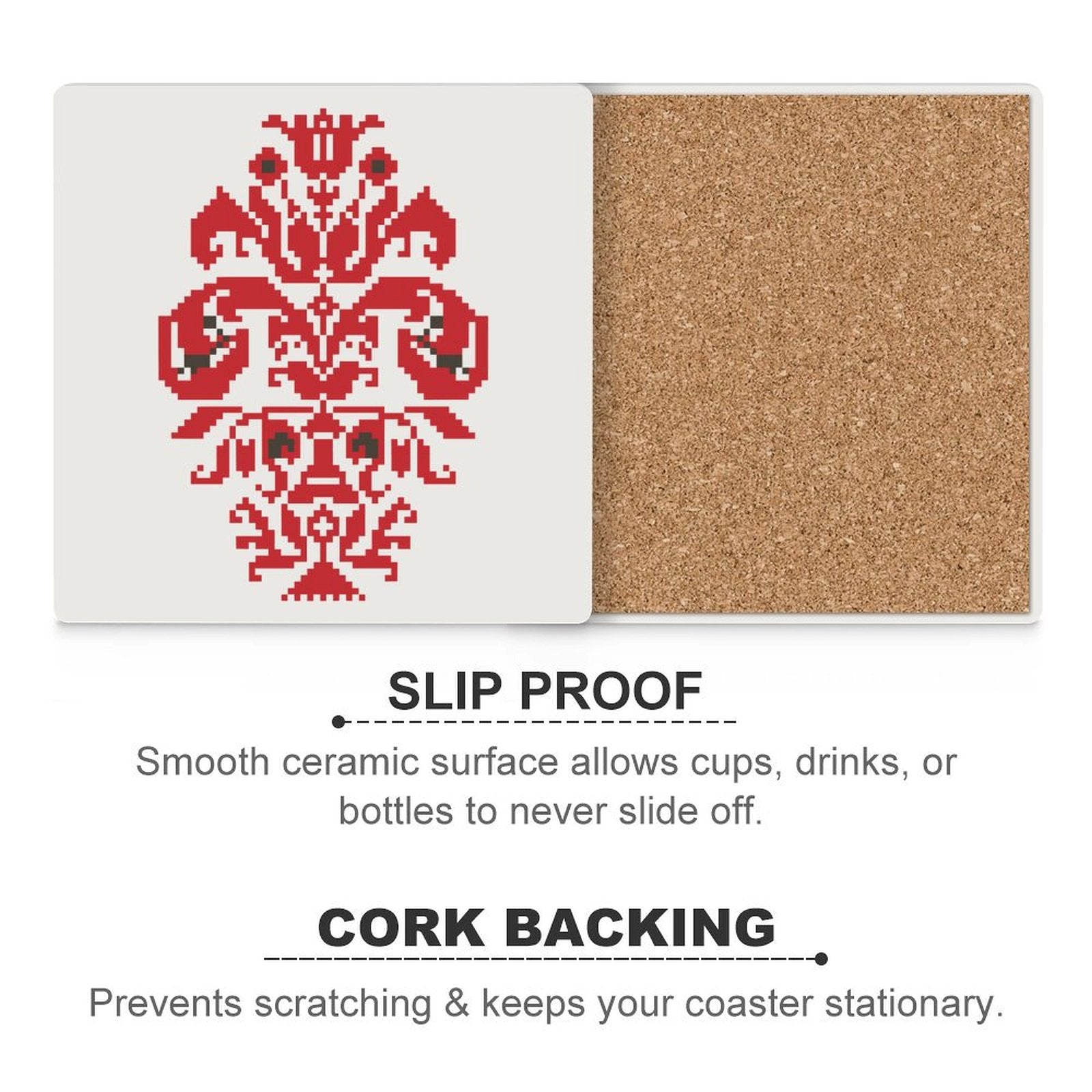 Infuse your space with cultural elegance. These ceramic coasters feature traditional Palestinian Tatreez patterns of a Qowara (Vase) bringing heritage and artistry to your table while protecting surfaces with style.