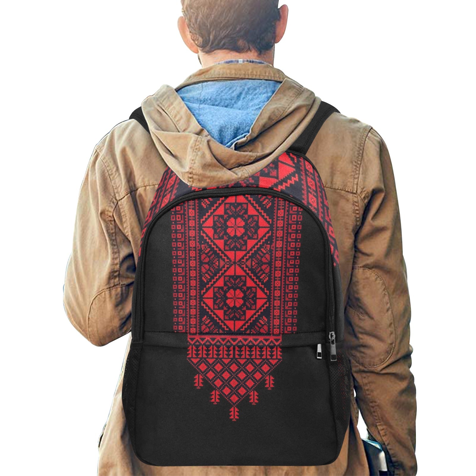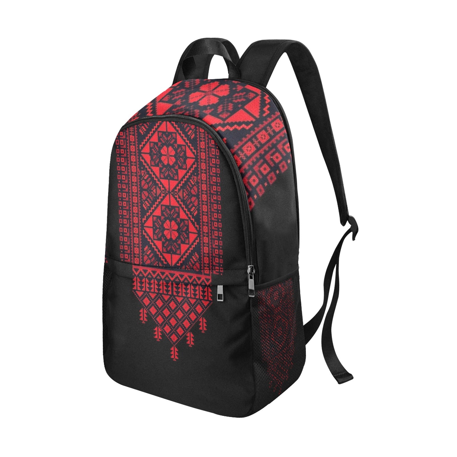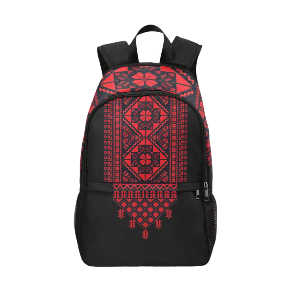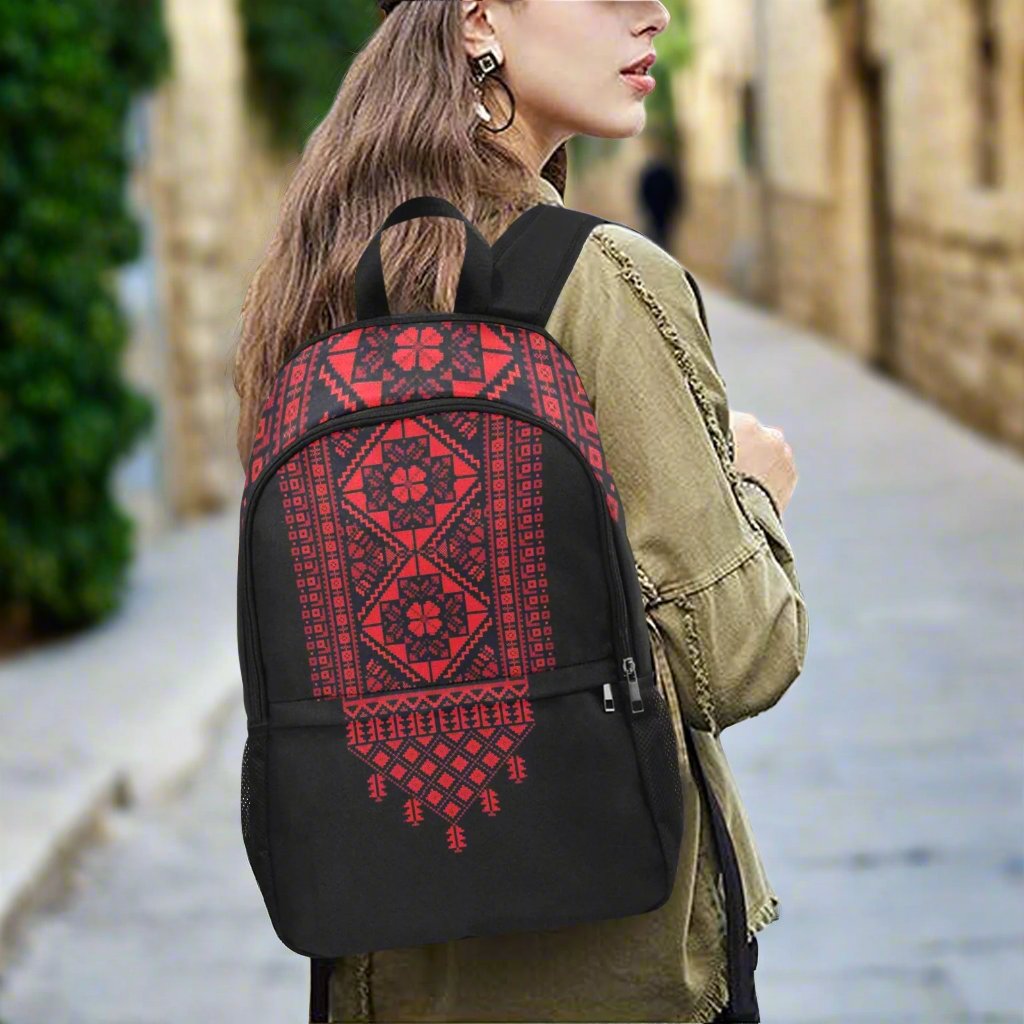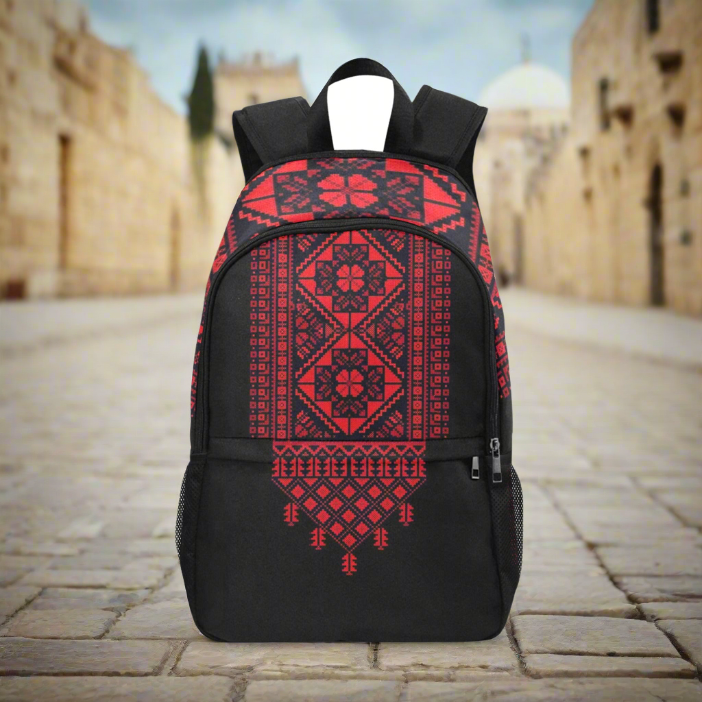 This stylish and durable backpack features a beautiful red Tatreez print, showcasing traditional Palestinian embroidery in a modern design. Made from 100% polyester, it’s lightweight yet sturdy, perfect for everyday use.