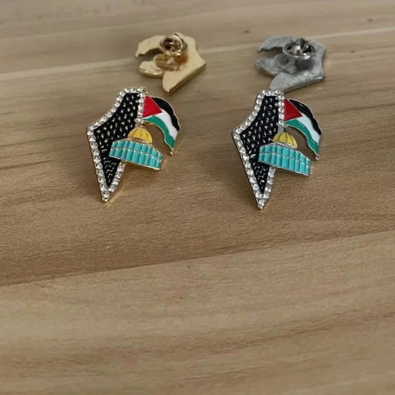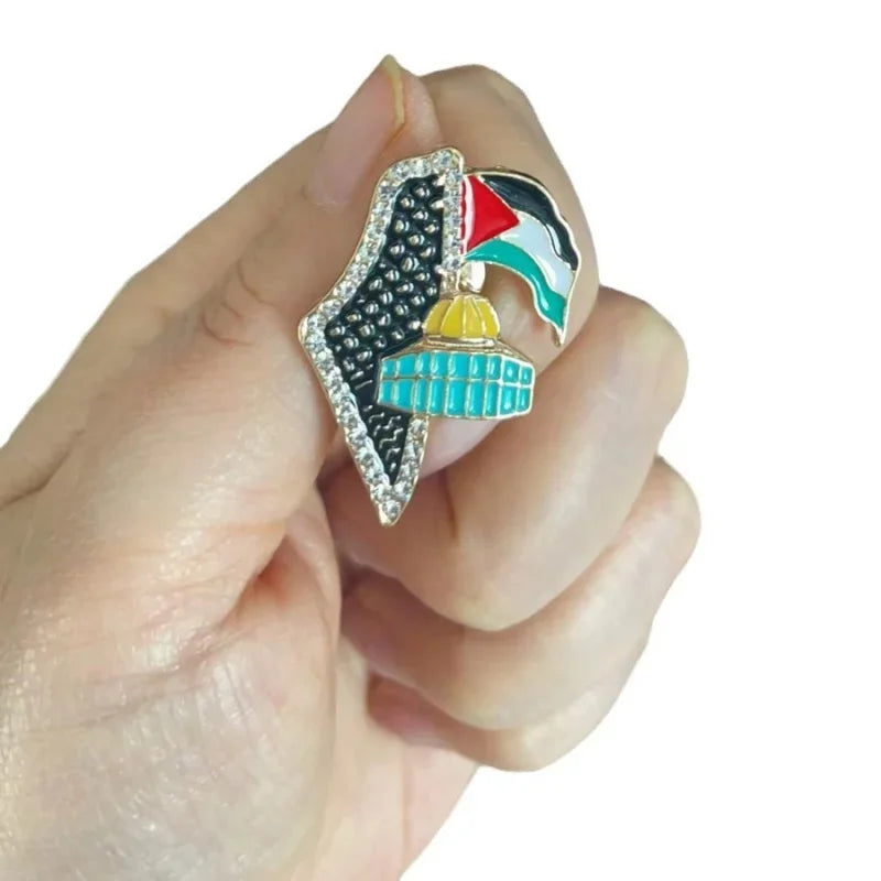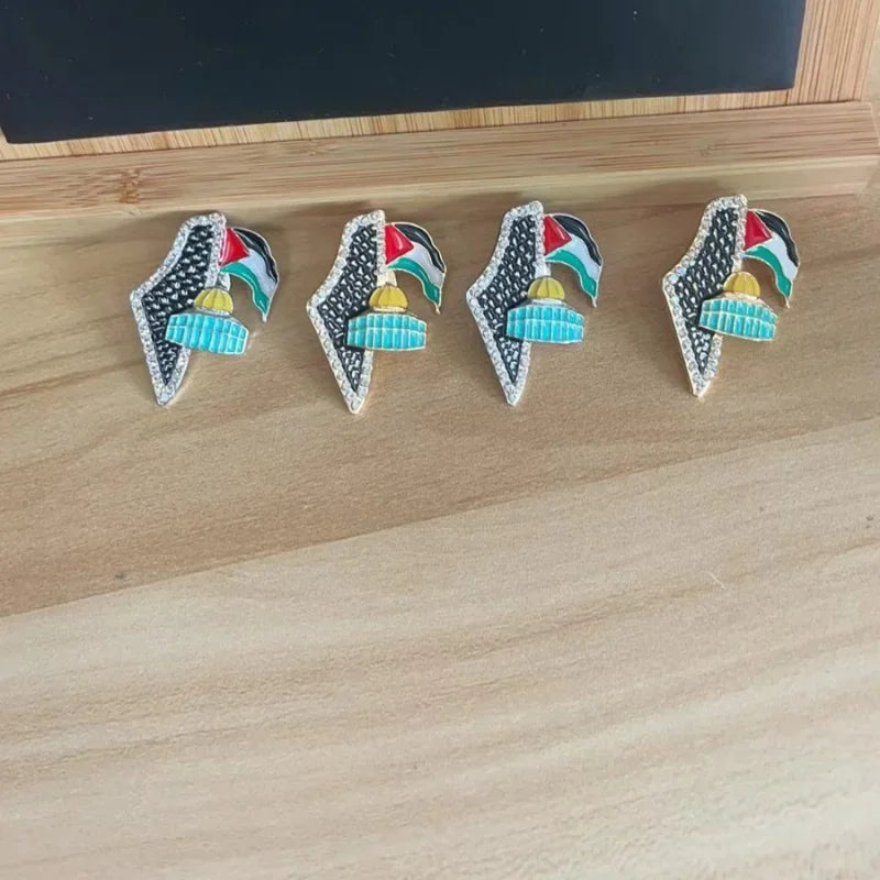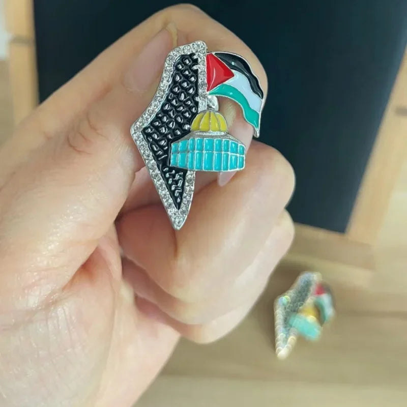 Introducing the Arab Map Palestine Scarf Brooch, a sophisticated accessory designed to elevate your style with cultural significance. Featuring intricate detailing including the Dome of the Rock, Map, and Flag of Palestine, this brooch makes a powerful statement while adding an elegant touch to your attire.