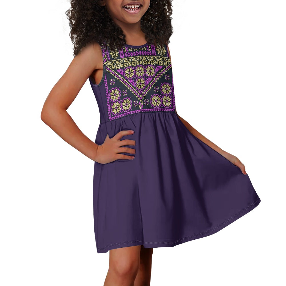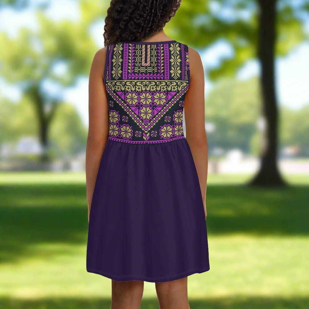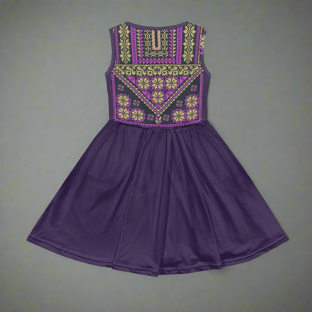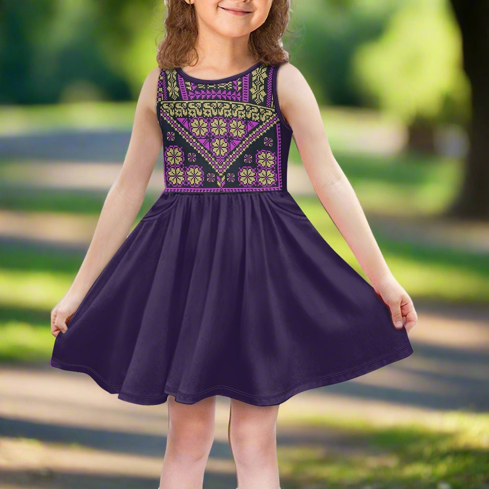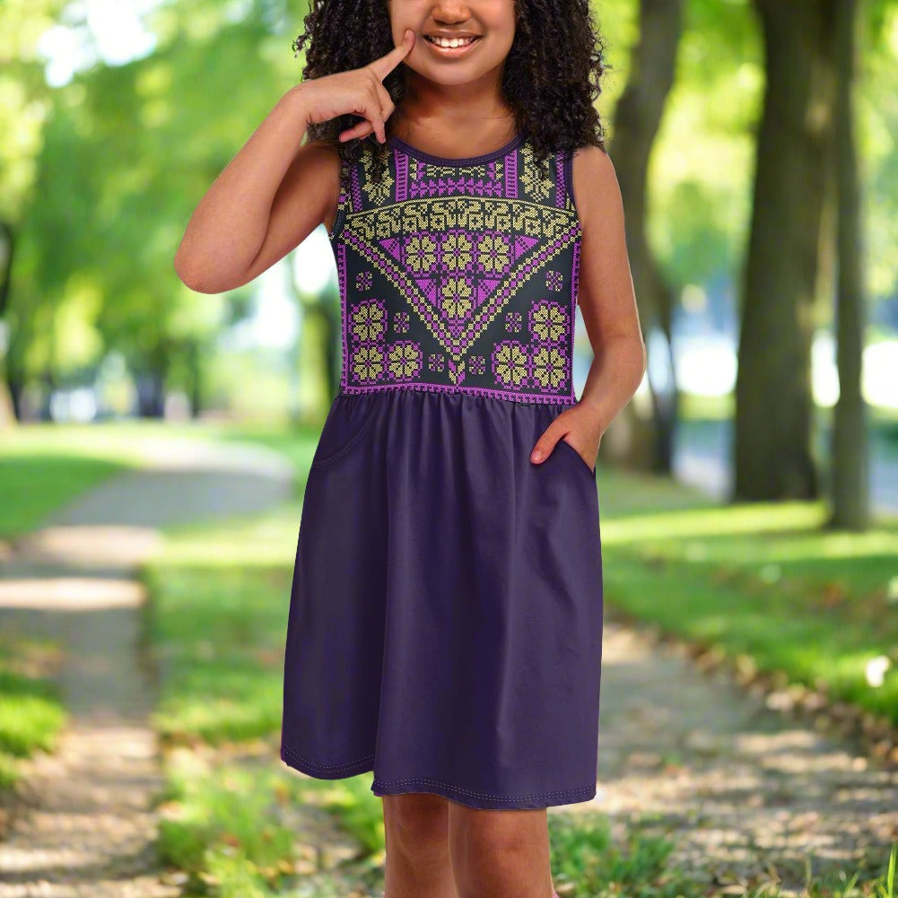 This dress not only showcases the traditional Palestinian tatreez print with pride but also combines functionality and style, making it an ideal choice for young ones to wear comfortably throughout the day.