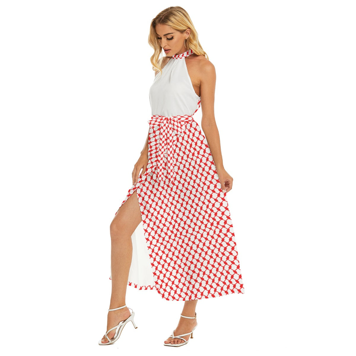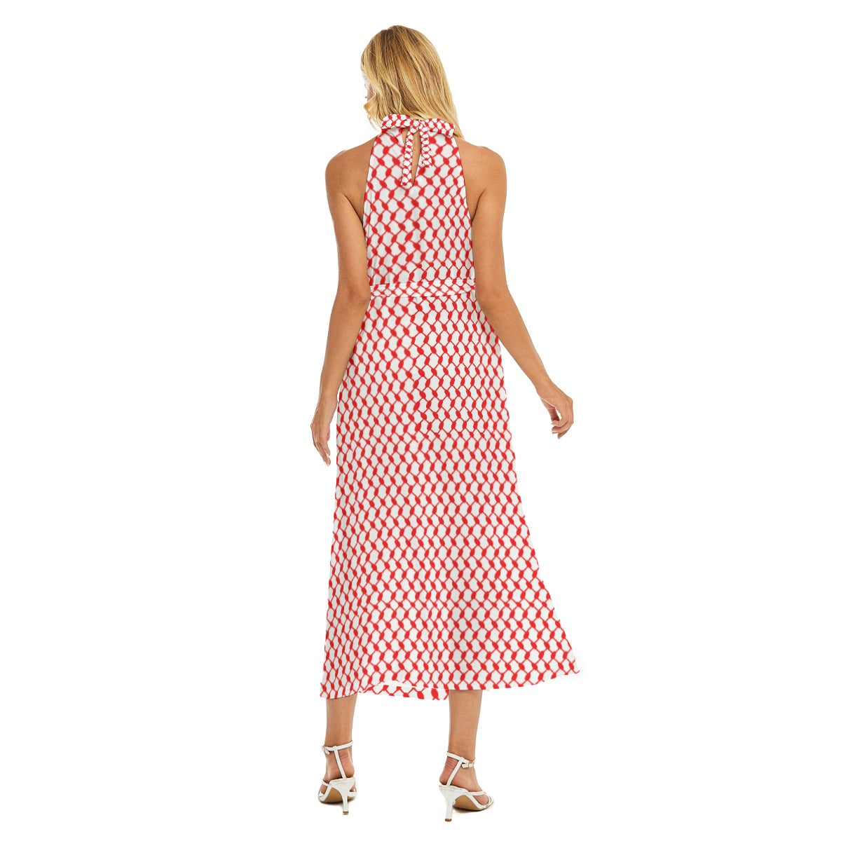 Red Kuffiyeh Jordanian Print Women's Wrap Hem Belted Halter Dress