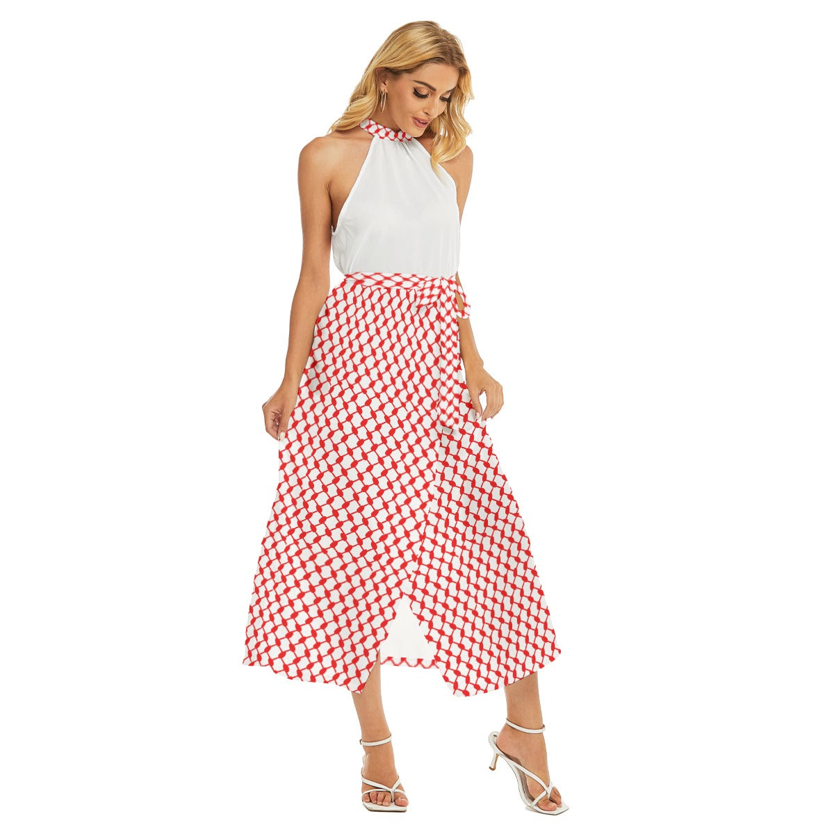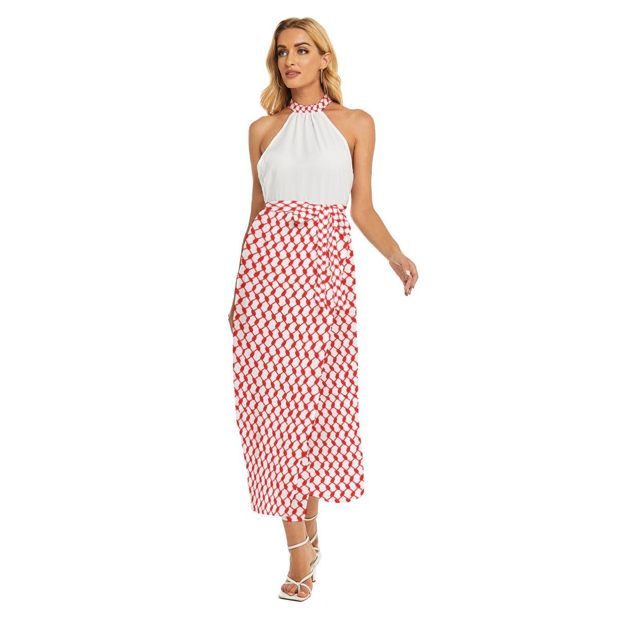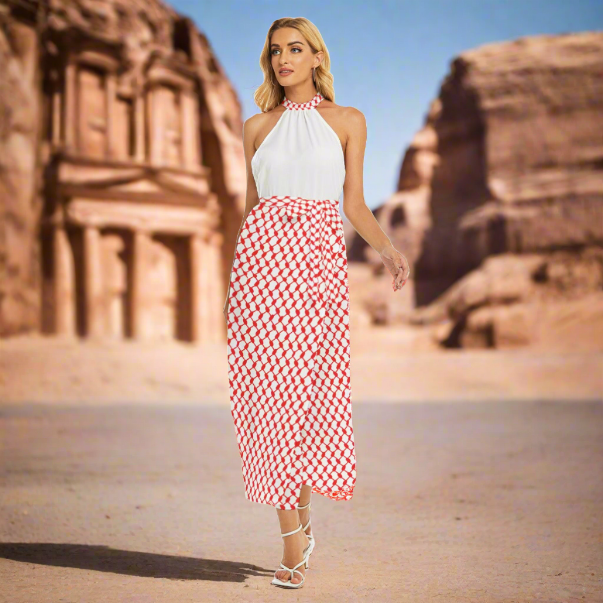 Whether you're heading to a casual day out or engaging in sports activities, the Women's Red Kuffiyeh Jordanian Print Wrap Hem Belted Halter Dress offers the perfect combination of comfort, style, and cultural pride.