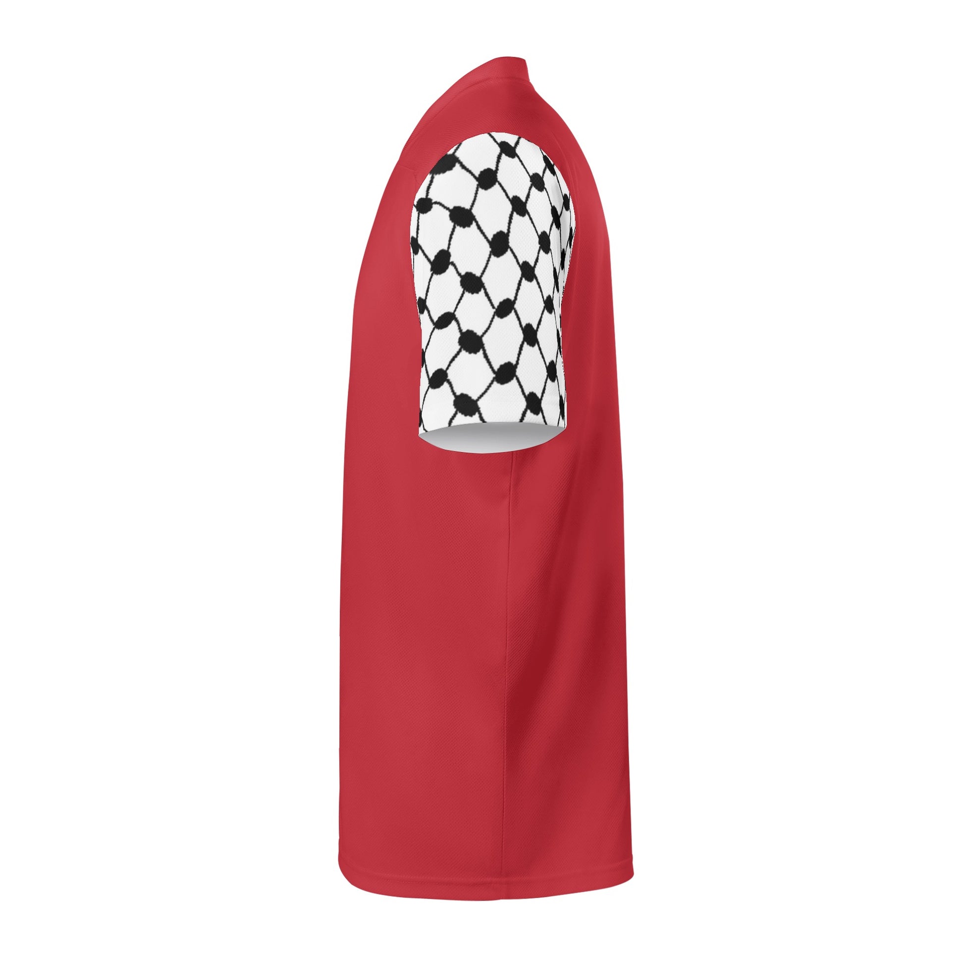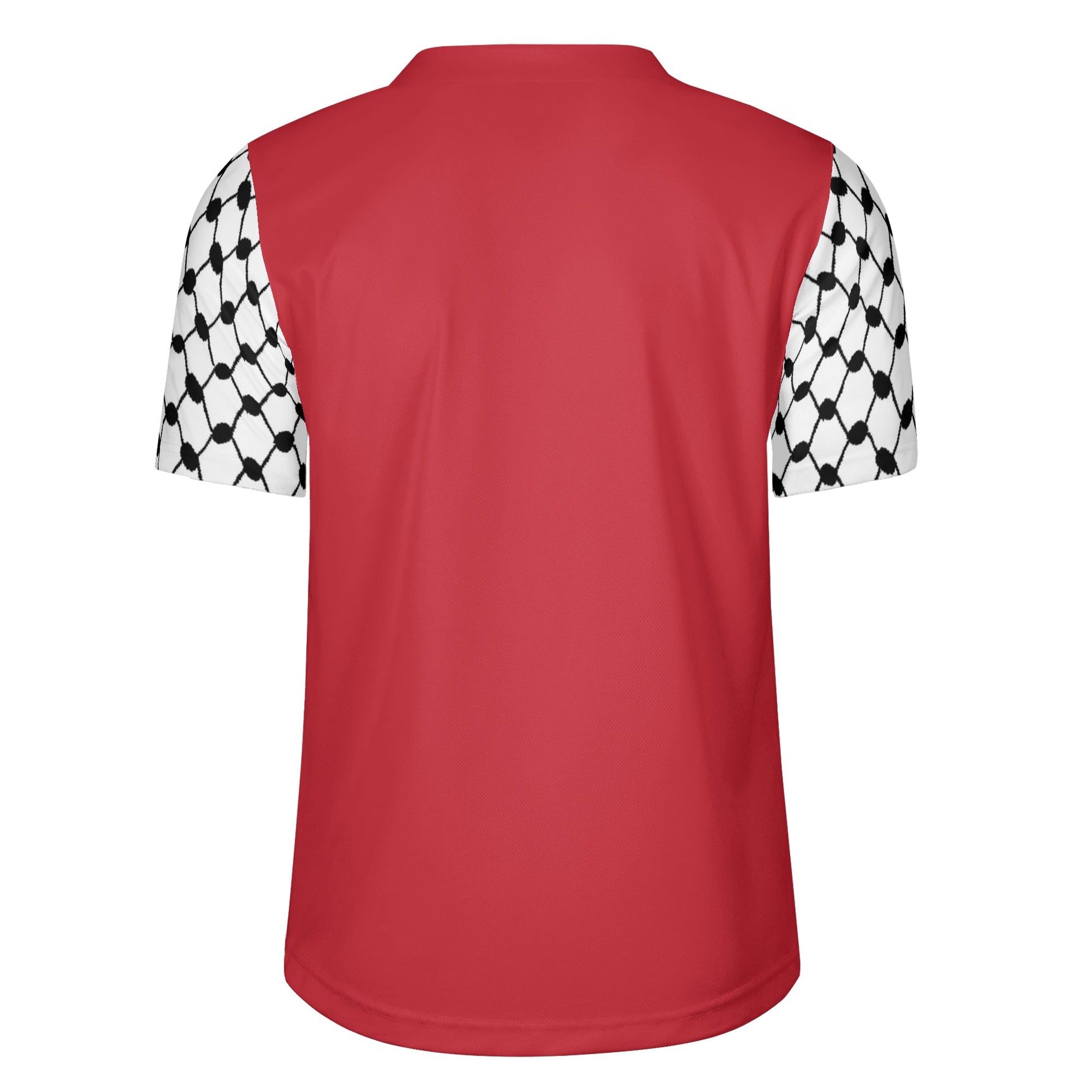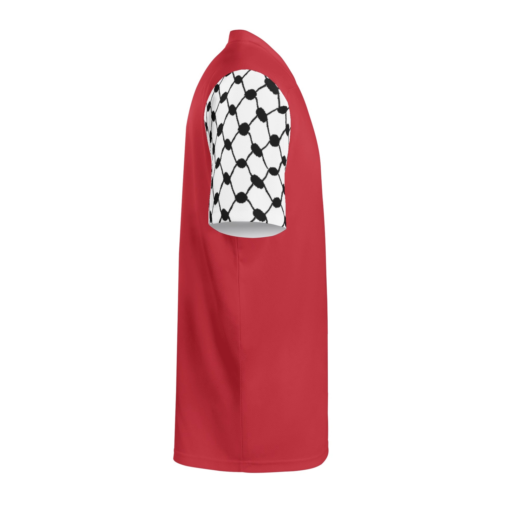 But that's not all—our jersey is designed with performance in mind. The lightweight and breathable mesh fabric provides essential ventilation, keeping you cool even when the competition heats up. The unique all-over keffiyeh print isn't just a nod to tradition; it's a statement piece that sets you apart from the crowd. Plus, you have the option to personalize it with your team's logo or name, making it a treasured item you'll wear with pride on and off the pitch.