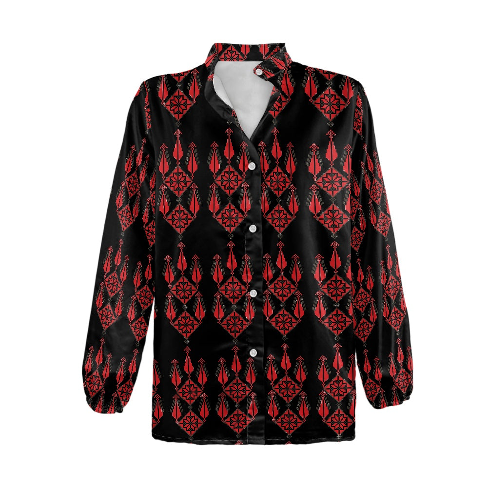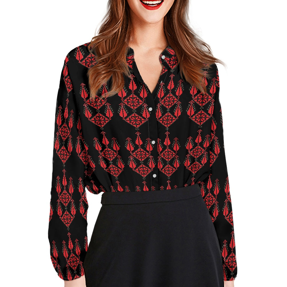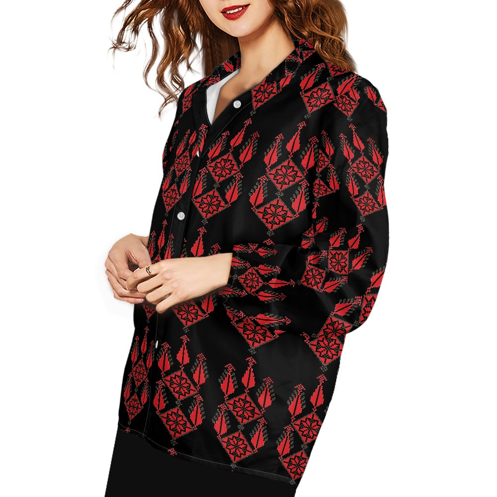 Experience the elegance of Palestinian craftsmanship with our Women's Long-Sleeved Shirt from Tatreez Bazaar. Made with high-quality polyester cloth, this shirt offers both durability and comfort, perfect for all-day wear.