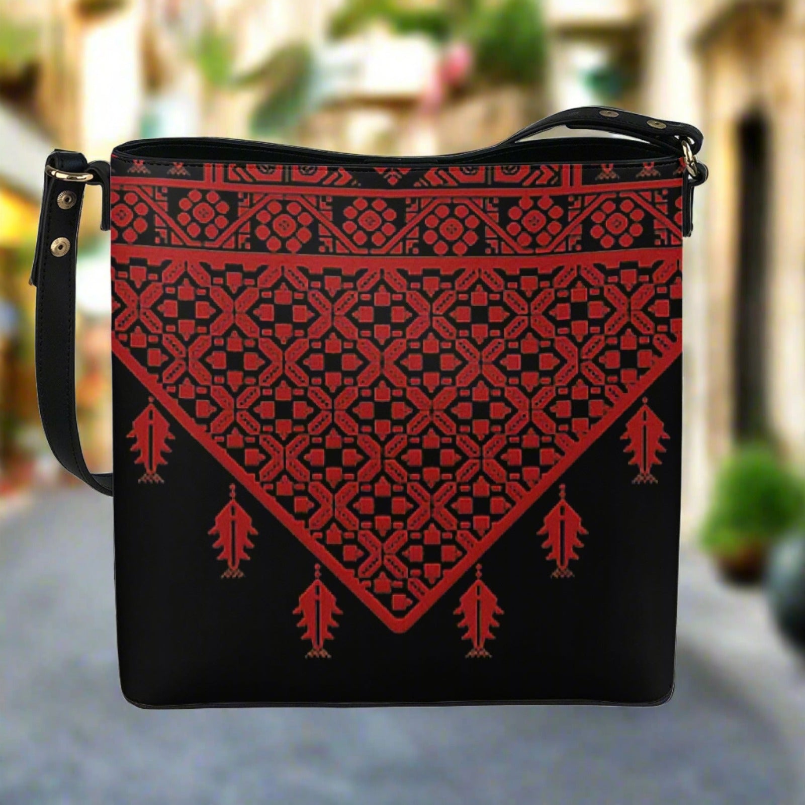 This Palestinian Tatreez Print Bucket Bag is designed for both style and functionality. Crafted from high-quality PU leather, it offers a luxurious feel with a glossy finish. Its waterproof feature ensures durability even during rainy seasons, providing confidence for everyday use.