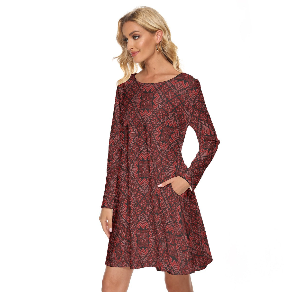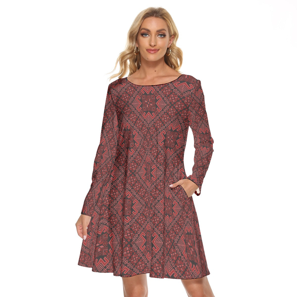 Introducing the Palestinian Tatreez Design Print Women's Crew Neck Dress, where cultural elegance meets modern comfort. Crafted by Tatreez Bazaar, this dress celebrates tradition with its exquisite tatreez design while offering a contemporary silhouette for the modern woman.