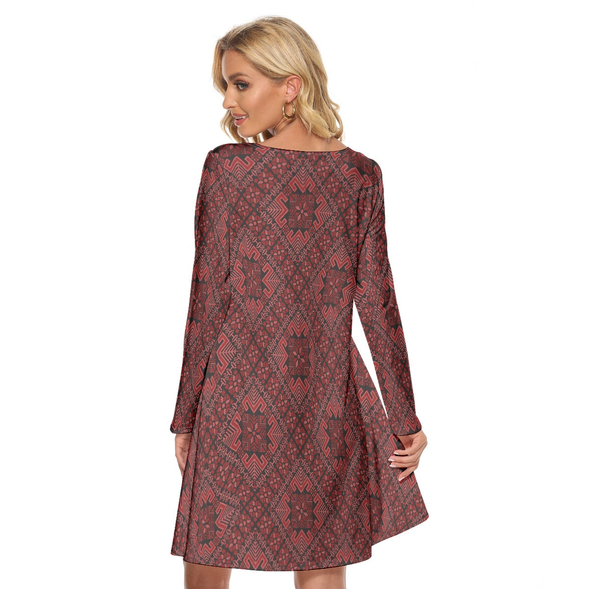 Palestinian Tatreez Print Women's Crew Neck Dress, Red
