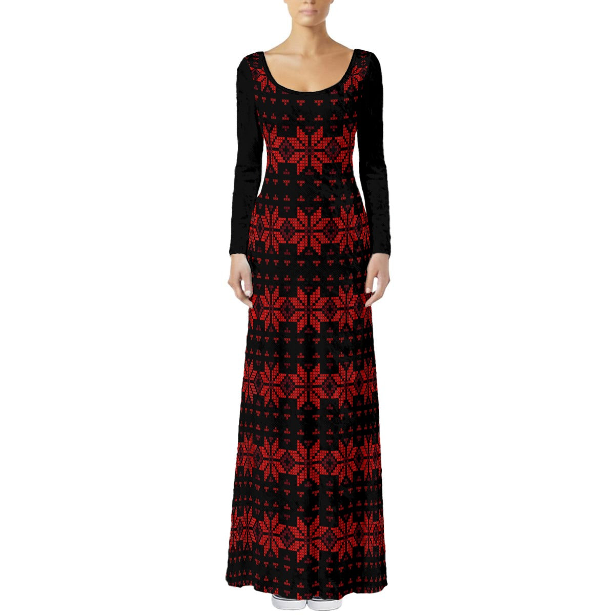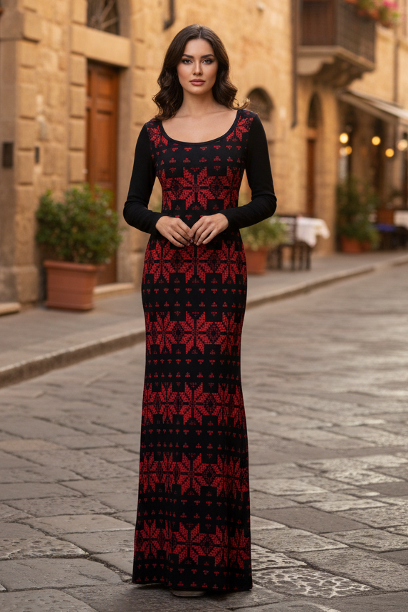 Celebrate heritage and elegance with this stunning long-sleeve maxi dress featuring an authentic Palestinian tatreez-inspired print. Crafted from premium short-pile velvet, the fabric offers a soft, silky texture and a subtle, elegant sheen that feels luxurious against the skin. The fitted silhouette beautifully accentuates feminine curves, while the smooth drape and scoop neckline add timeless sophistication.