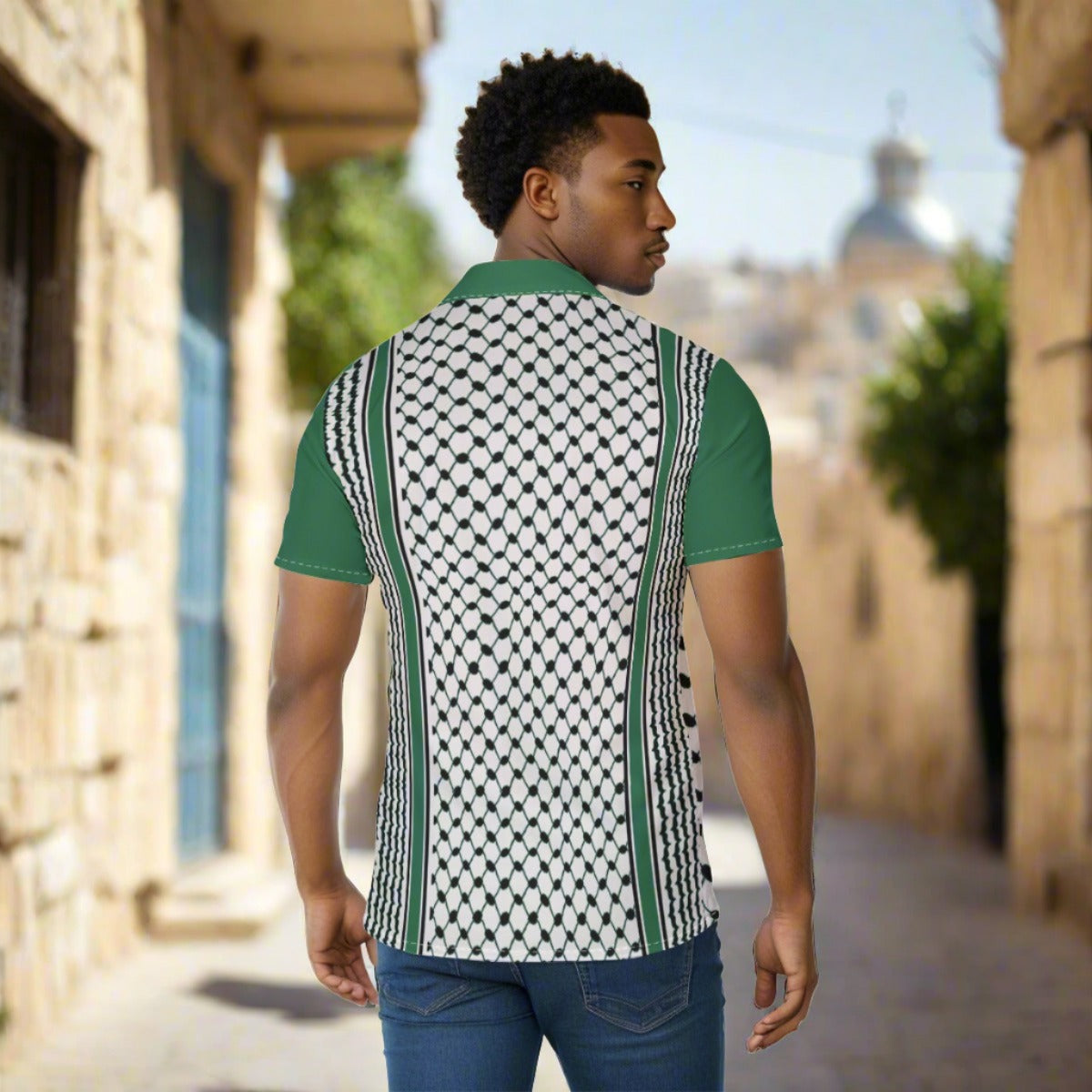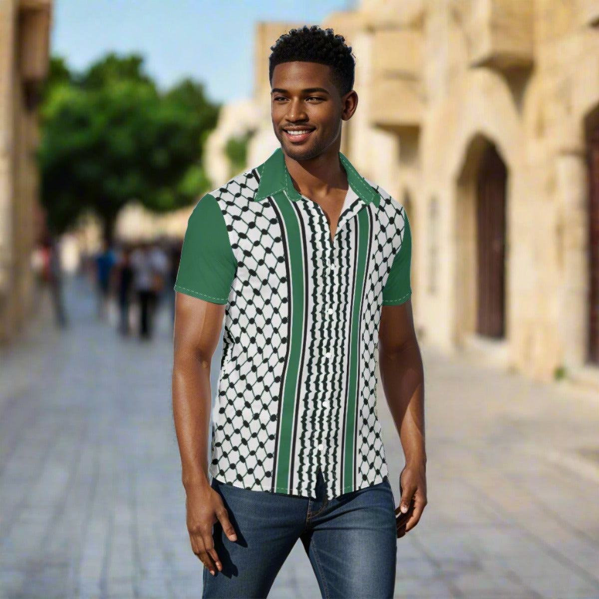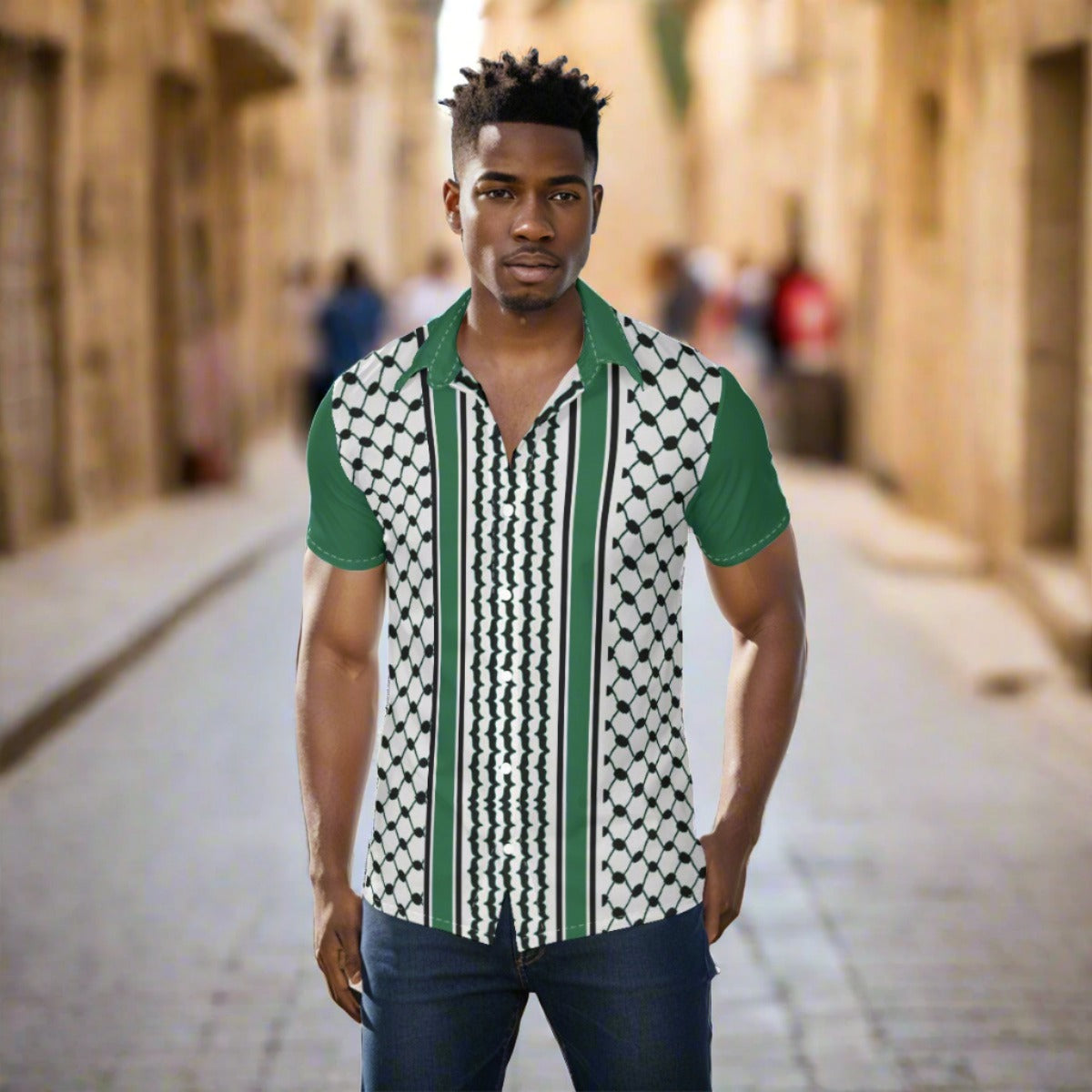 Elevate your wardrobe with the Reinvented Palestinian Kuffiyeh Print Men's Shirt from Tatreez Bazaar. Embrace a blend of tradition and modernity, and make a stylish statement wherever you go