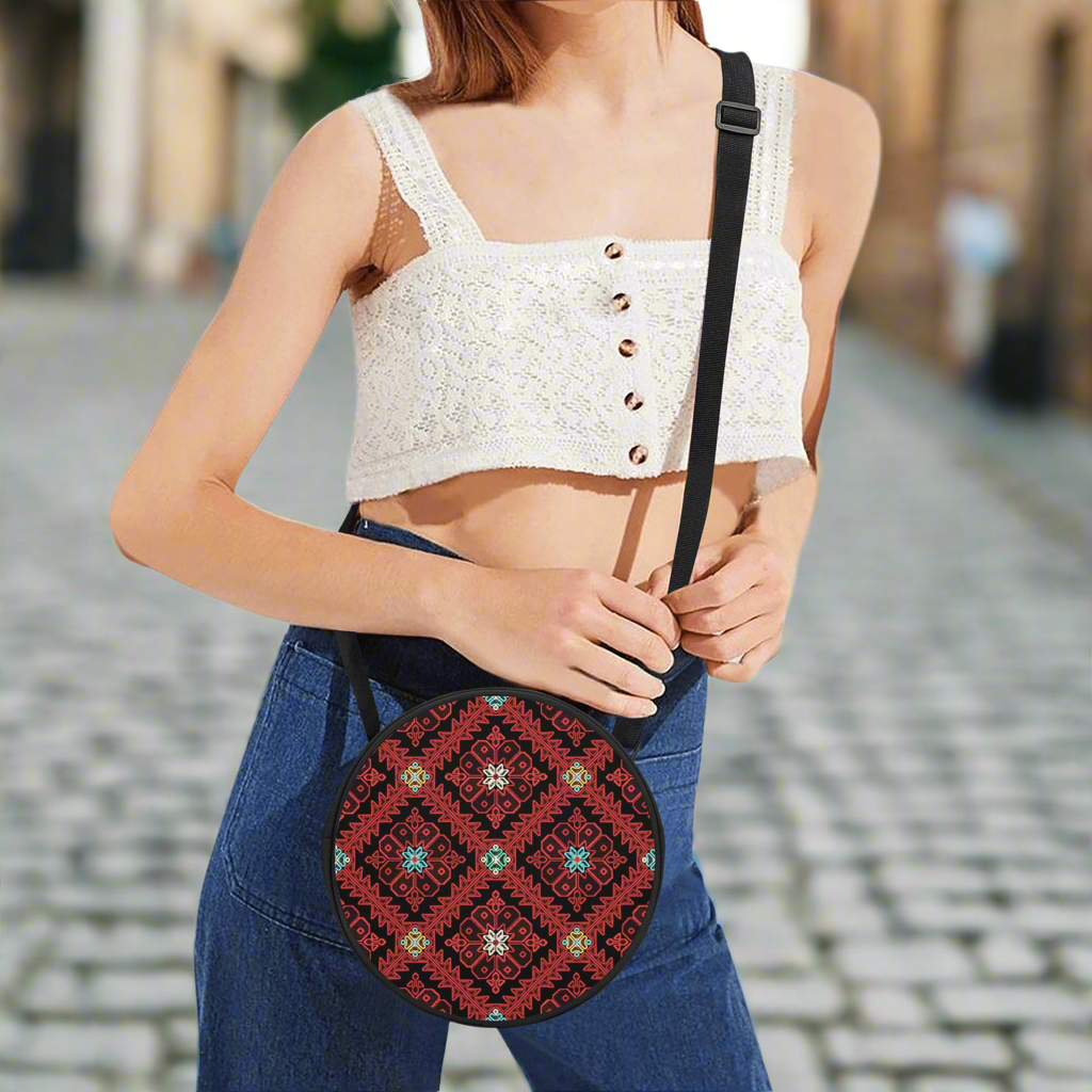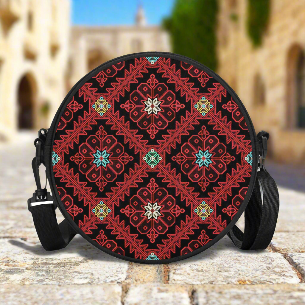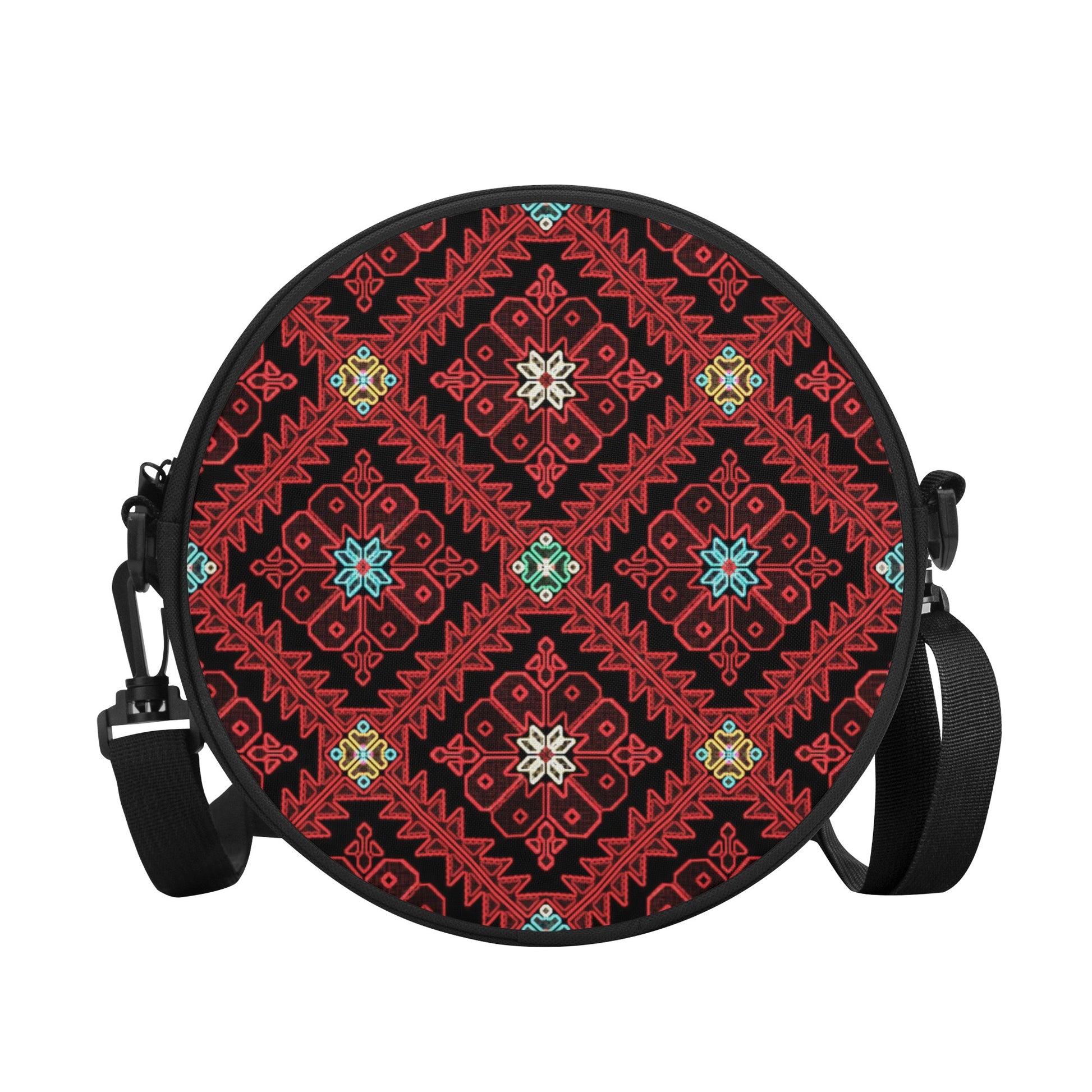 This beautiful Round Satchel Bag has a Palestinian Realistic print in the classic cross stitch pattern. The vibrant red color will make this bag stand out from the crowd. Crafted from a durable polyester canvas fabric, this cute small bag is complete with a black back and a large compartment to store phones, keys and all the daily essentials you need. It features a single zippered round closure and an adjustable shoulder strap for comfortable carrying.