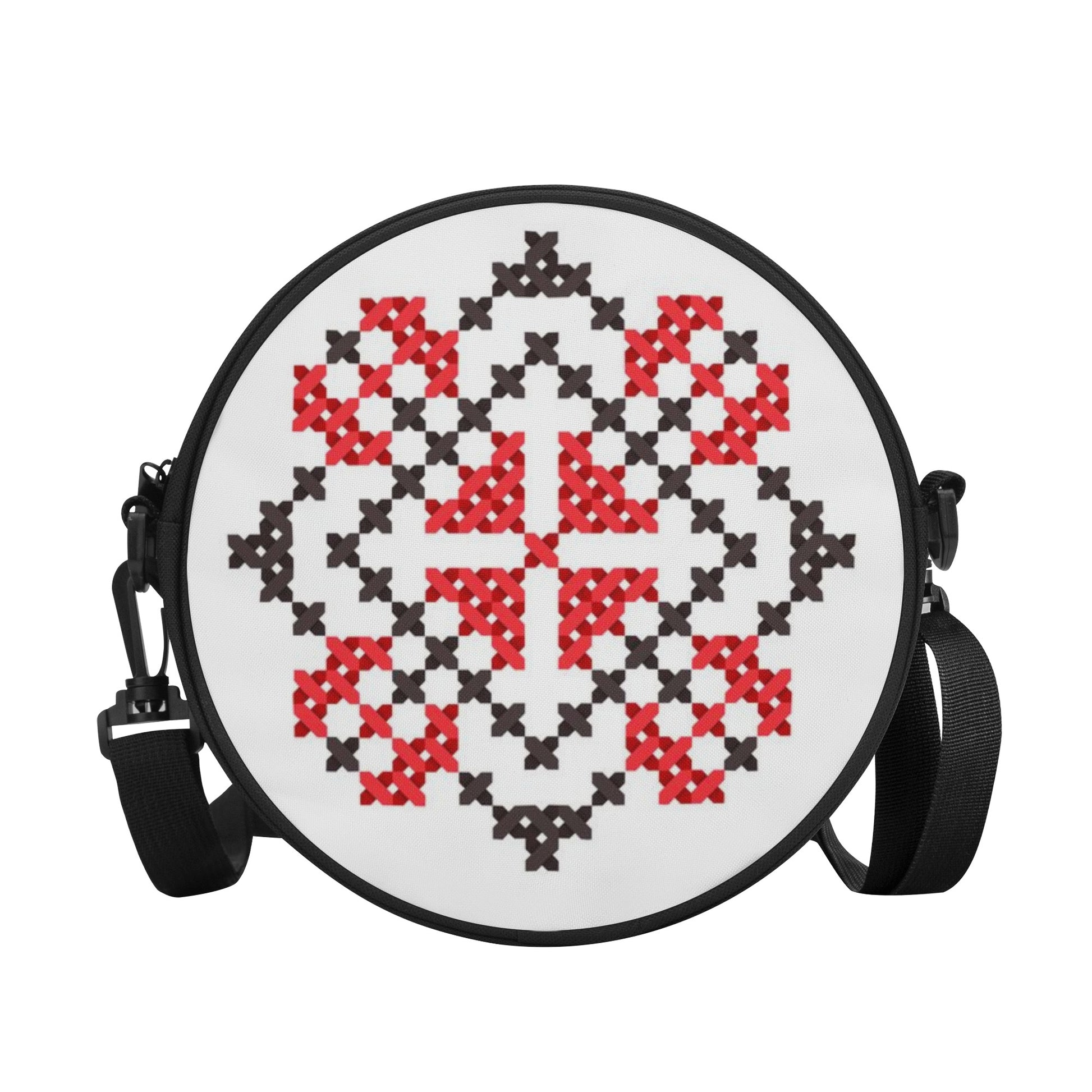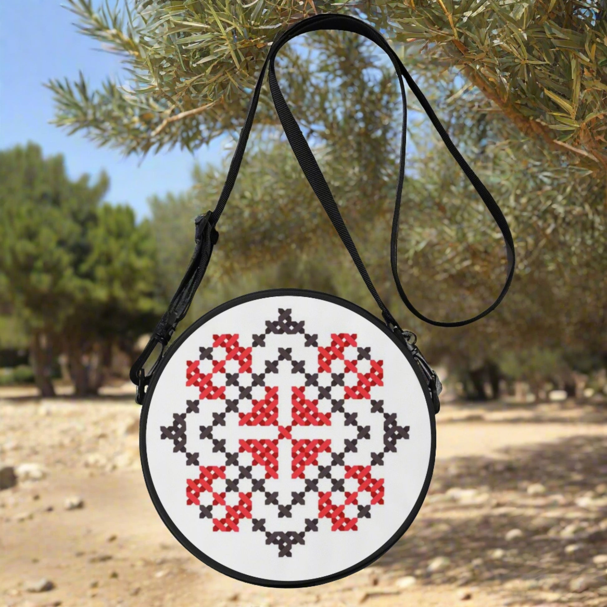 Measuring at a convenient size, this bag is designed to comfortably house your essentials like a phone, keys, and wallet within its large main compartment. The black back panel provides a sleek contrast to the colorful tatreez print, ensuring that your style stands out in any crowd. The secure zippered closure keeps your belongings safe, while the adjustable shoulder strap offers versatile carrying options, whether you prefer it slung across the body or resting on your shoulder. This round cross-body bag is not only a chic addition to your accessory collection but also a practical companion for a variety of occasions, from back-to-school buzz to leisurely outdoor adventures.