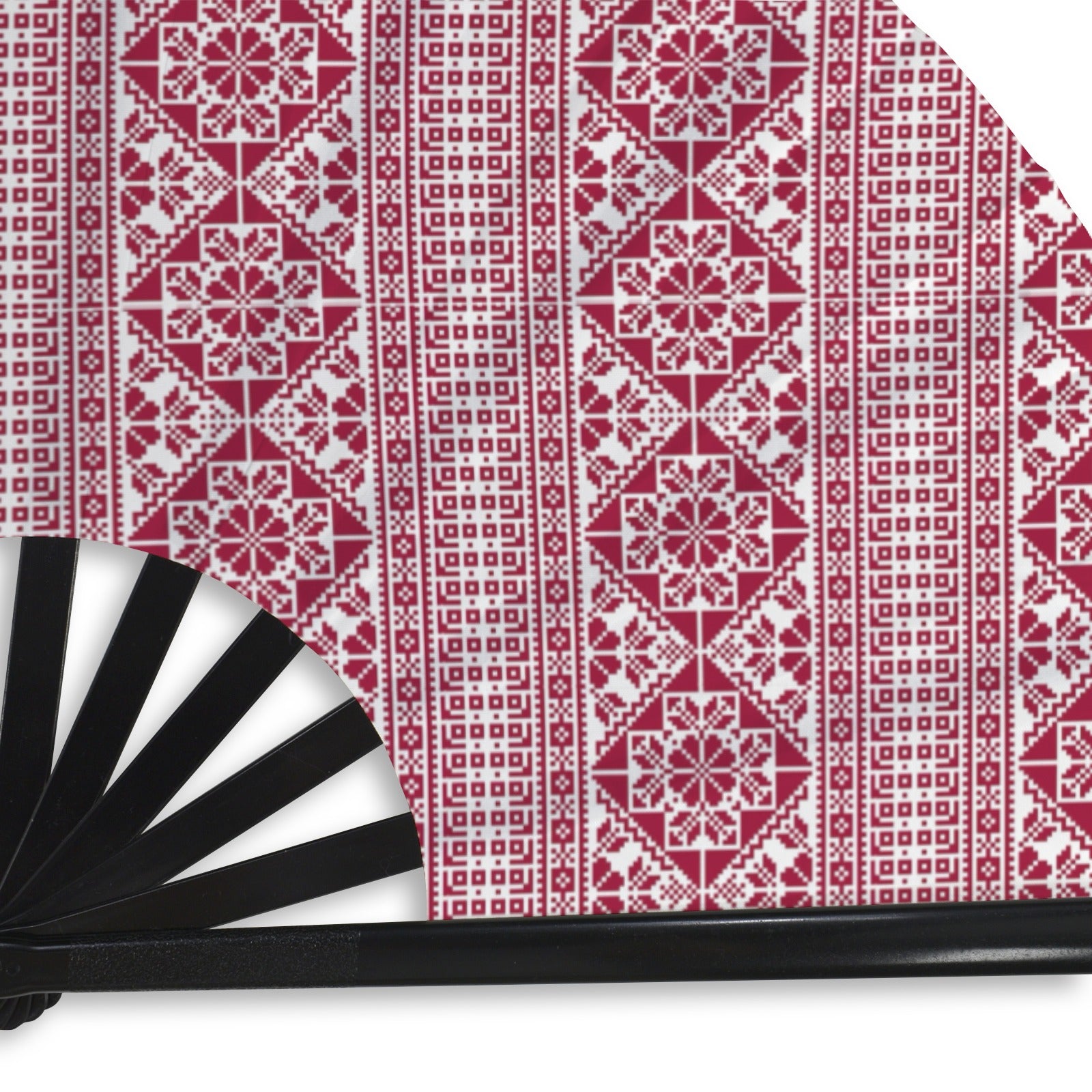 Add a touch of cultural elegance and vibrant style to your look with this Tatreez Print Folding Clack Fan, inspired by traditional Palestinian embroidery patterns. Perfect for making a statement at any event!