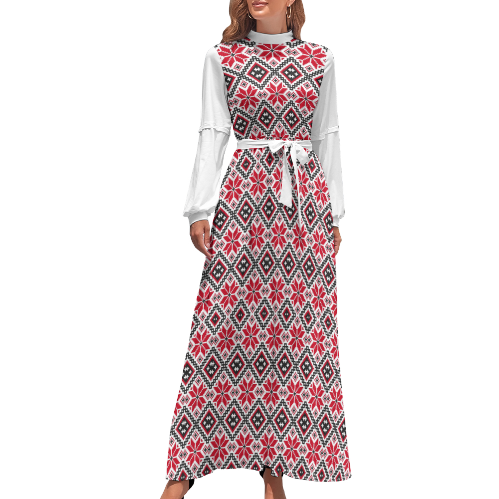 This dress is not only a celebration of rich heritage but also a nod to modern fashion sensibilities. Its long sleeves and high neck offer a sophisticated silhouette, while the customizable fabric makes each piece unique to its wearer. Easy to care for, you can keep this garment looking its best with simple hand or machine washing. Please note that due to the unique nature of its production, slight variations in color, print position, or size may occur, making each dress uniquely yours.