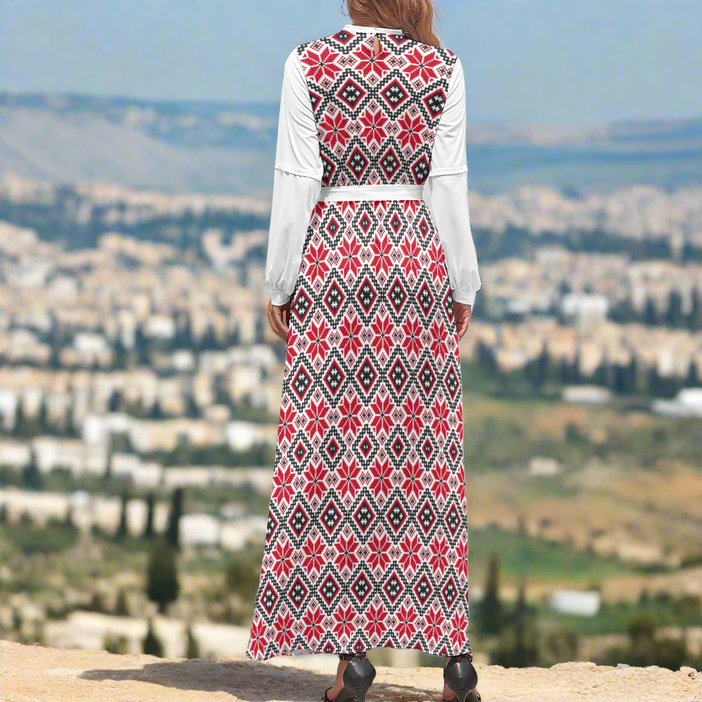 Immerse yourself in the art of traditional Palestinian embroidery with this stunning Tatreez Print Women's Long Sleeves High Neck Dress. It is a work of art crafted with precision and passion, now available on Tatreez Bazaar to bring a touch of cultural heritage into your wardrobe.