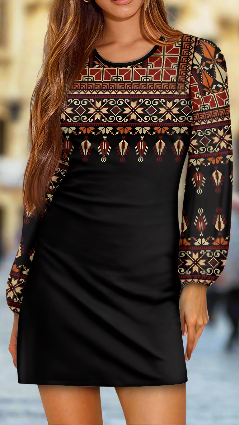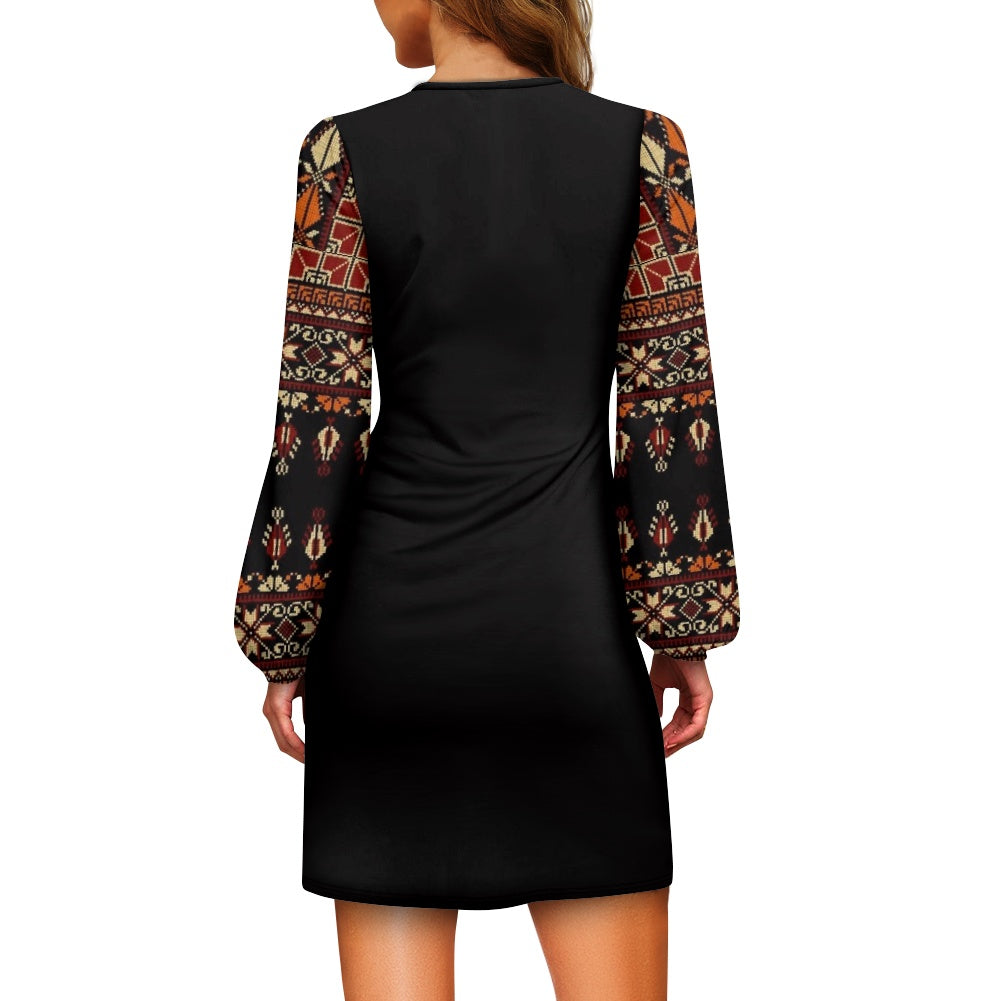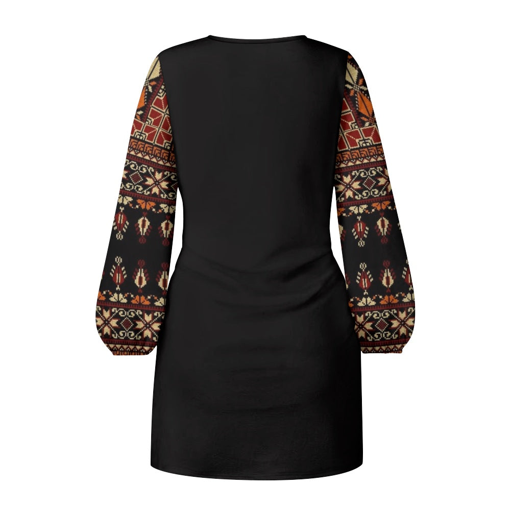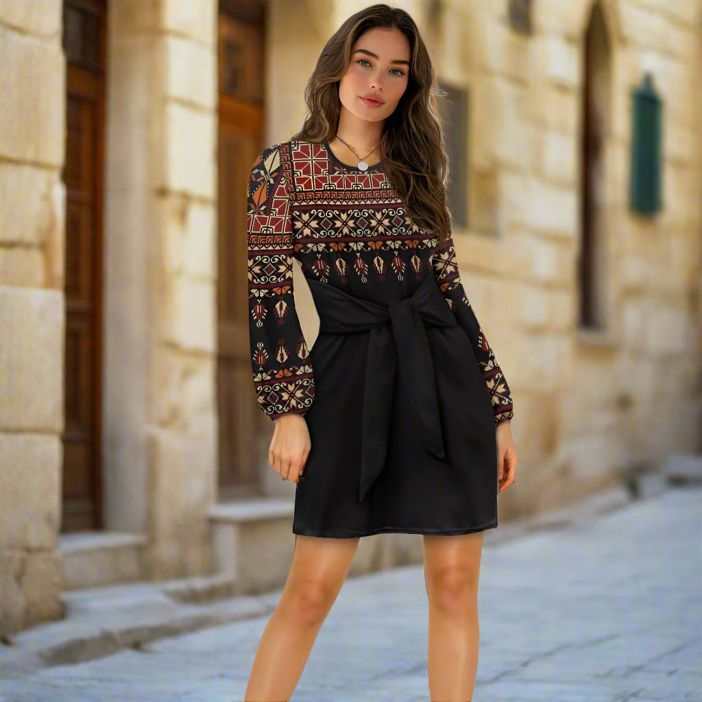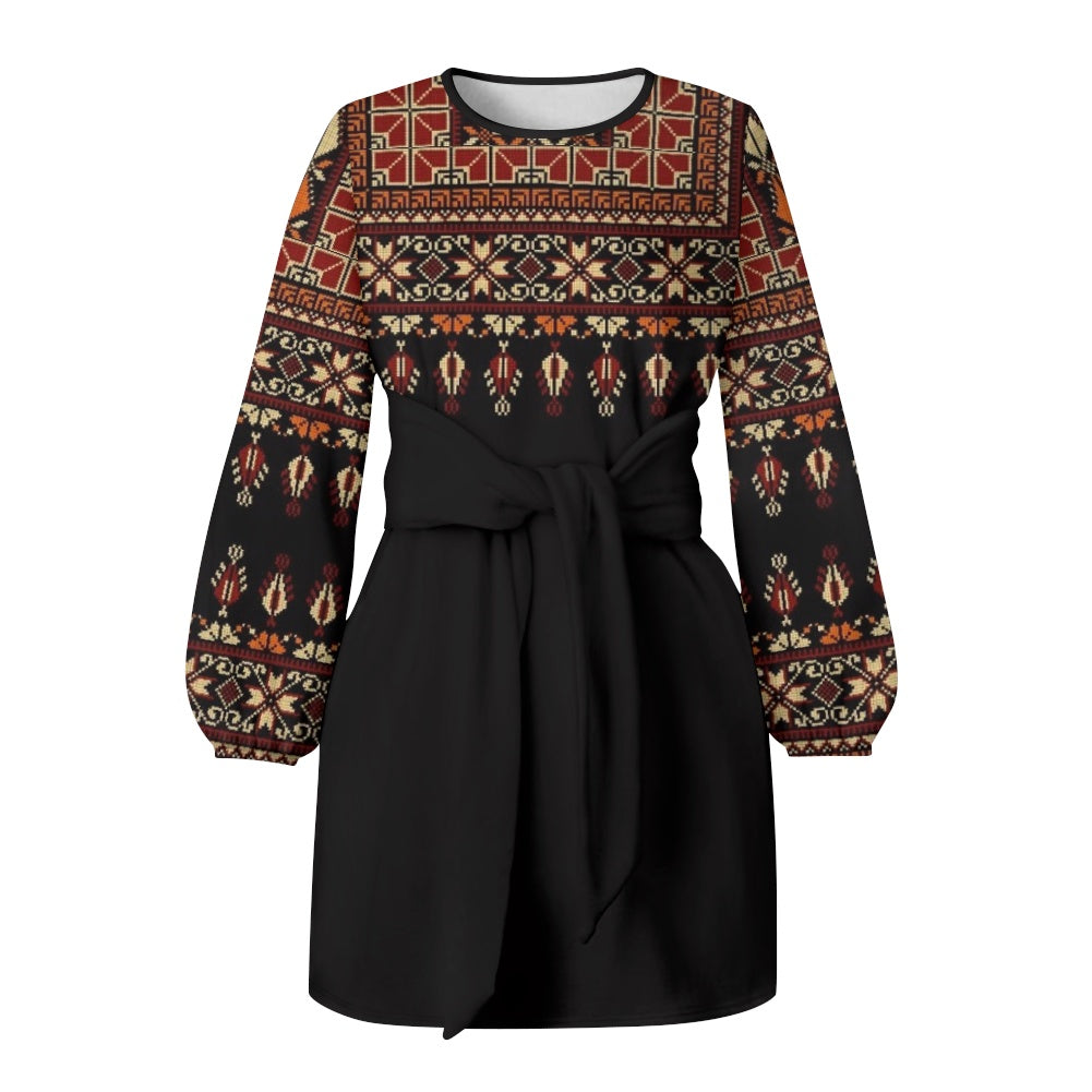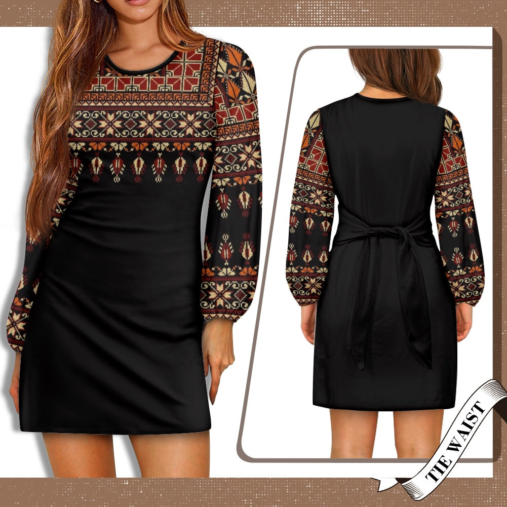 Palestinian Tatreez Print Waist Long Sleeve Tie Dress