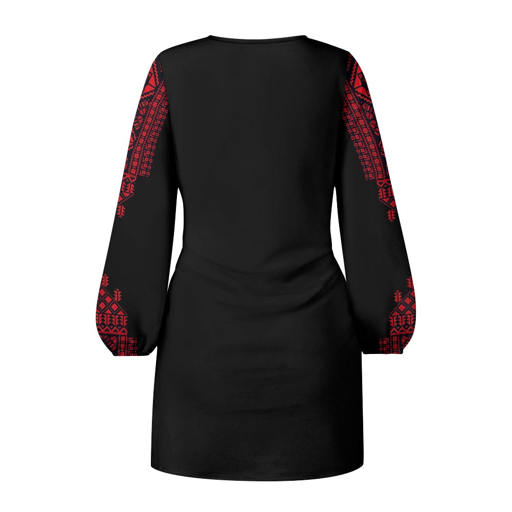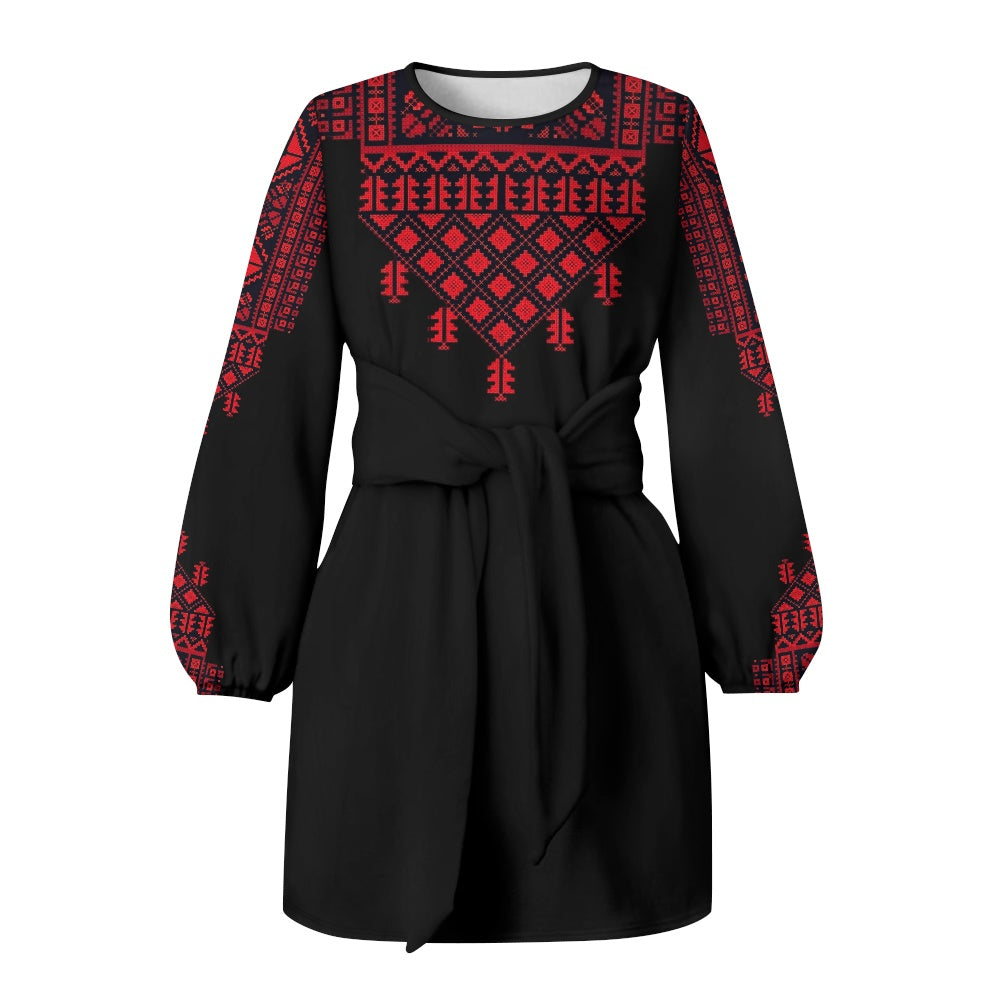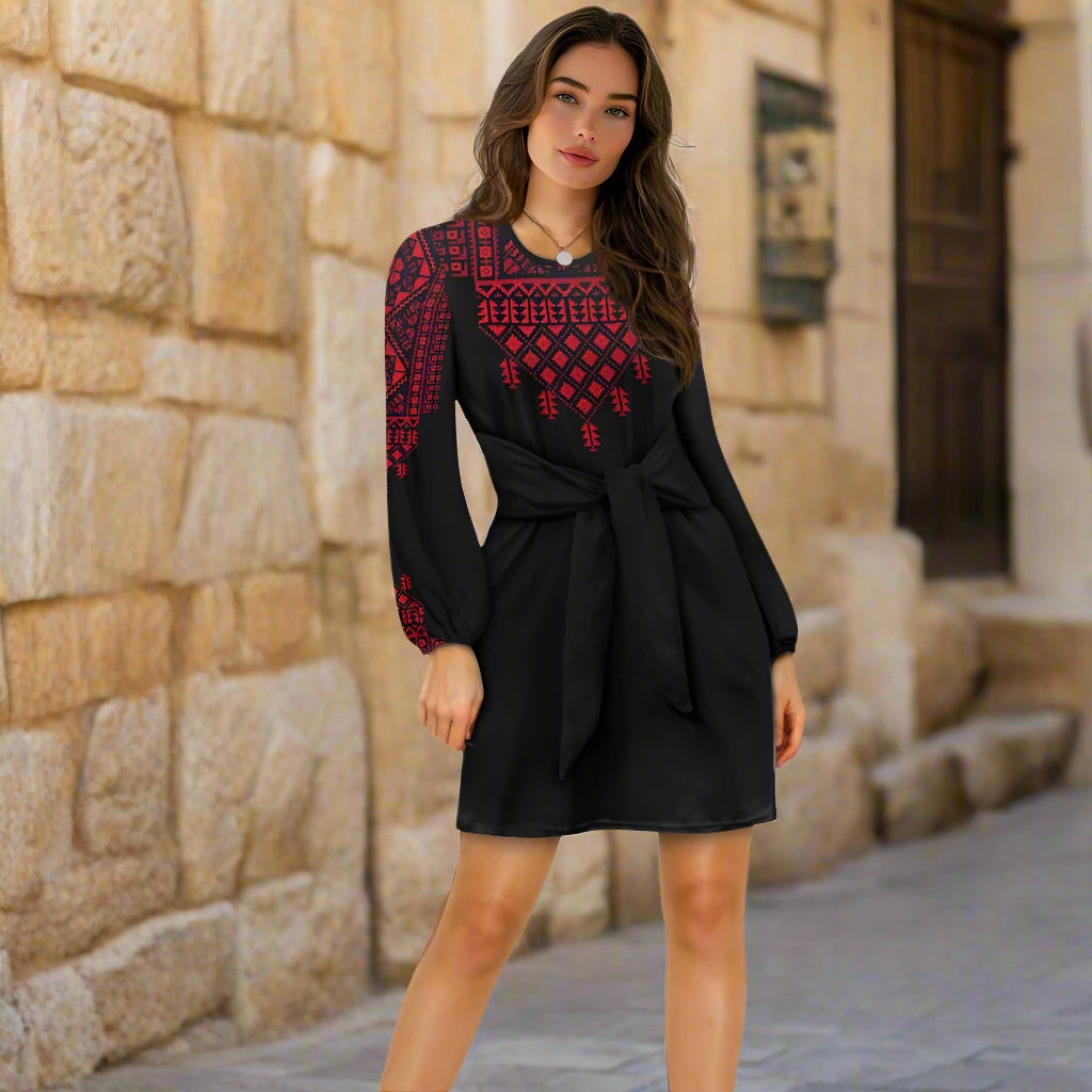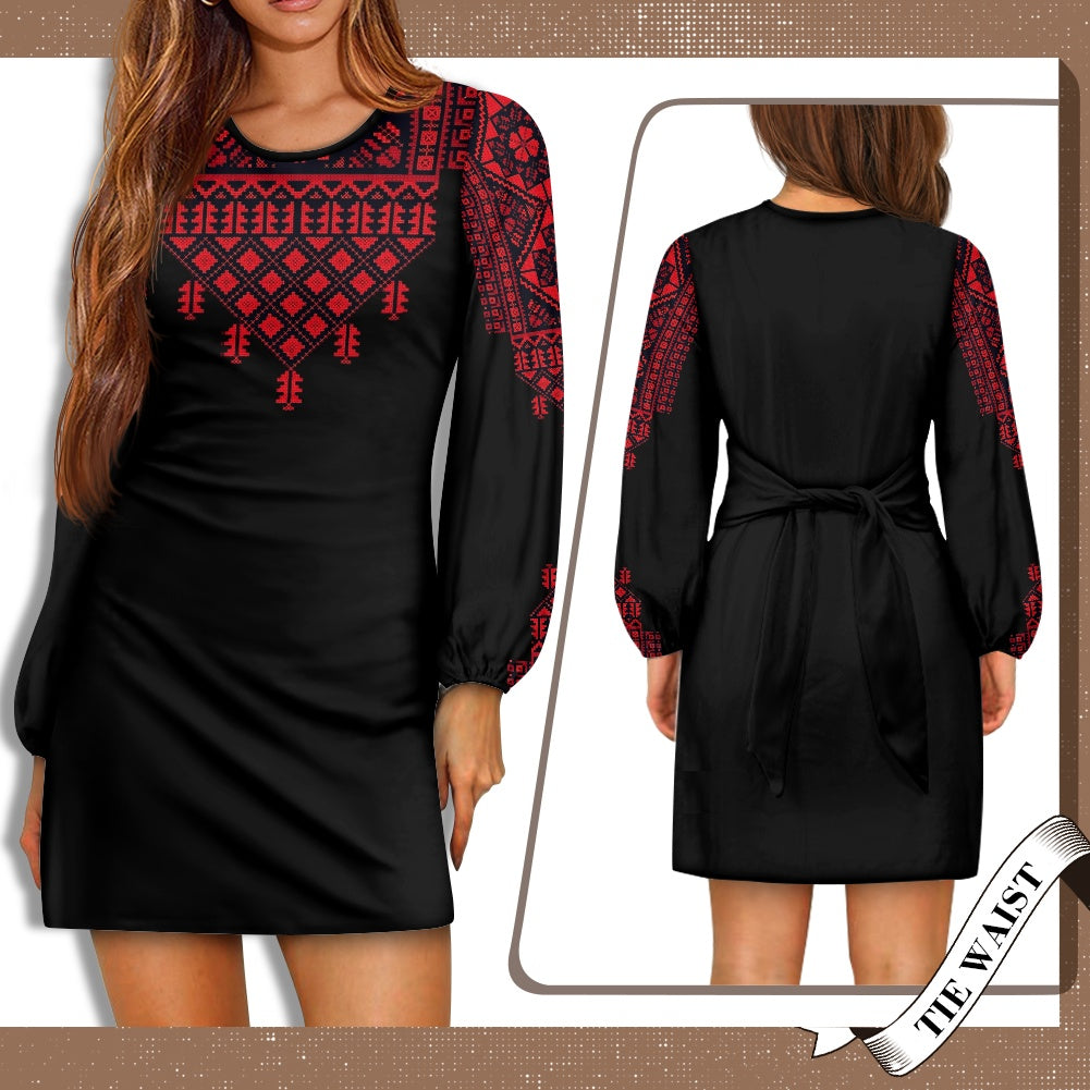 Palestinian Tatreez Print Waist Long Sleeve Tie Dress