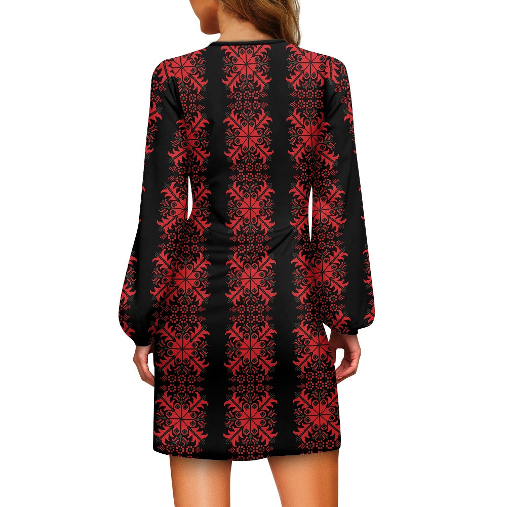 Celebrate cultural artistry with this Long Sleeve Dress, beautifully adorned with a realistic Palestinian Gaza Tatreez print on the Waist tie. Designed for elegance and comfort, this dress combines tradition with modern sophistication.