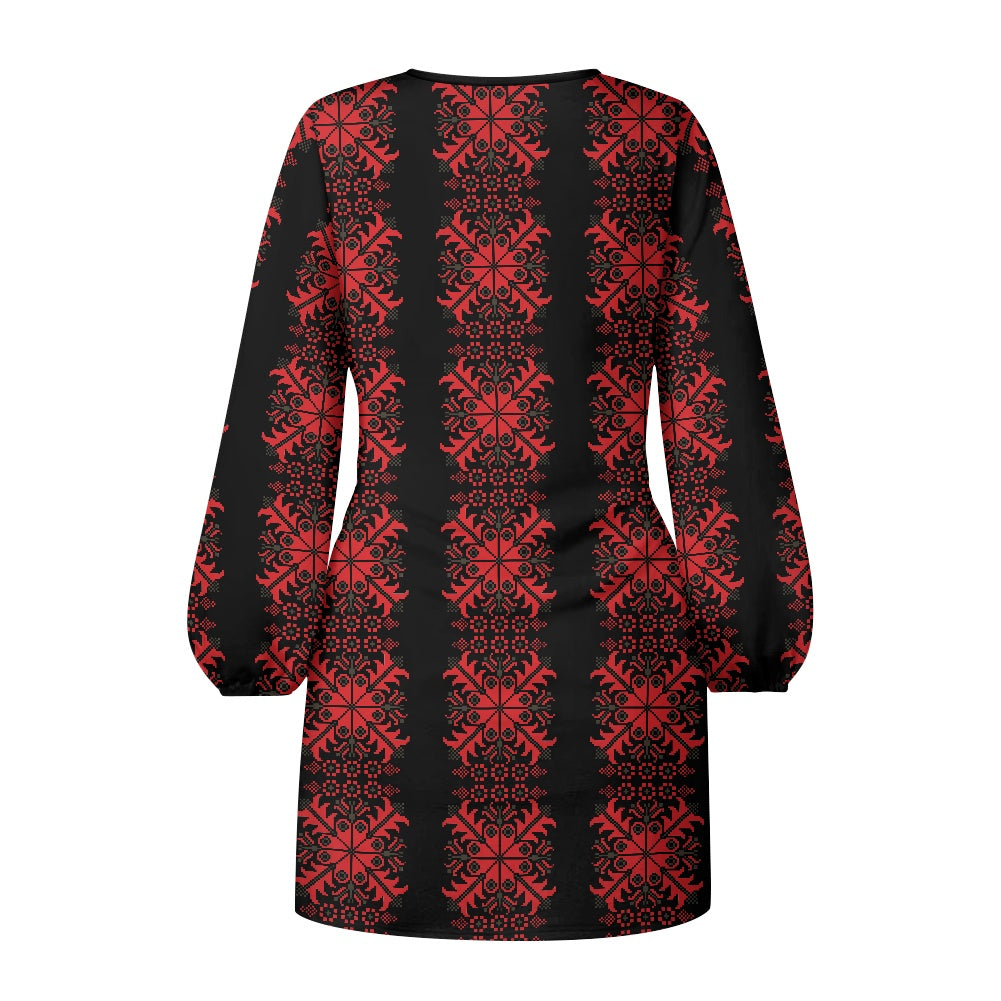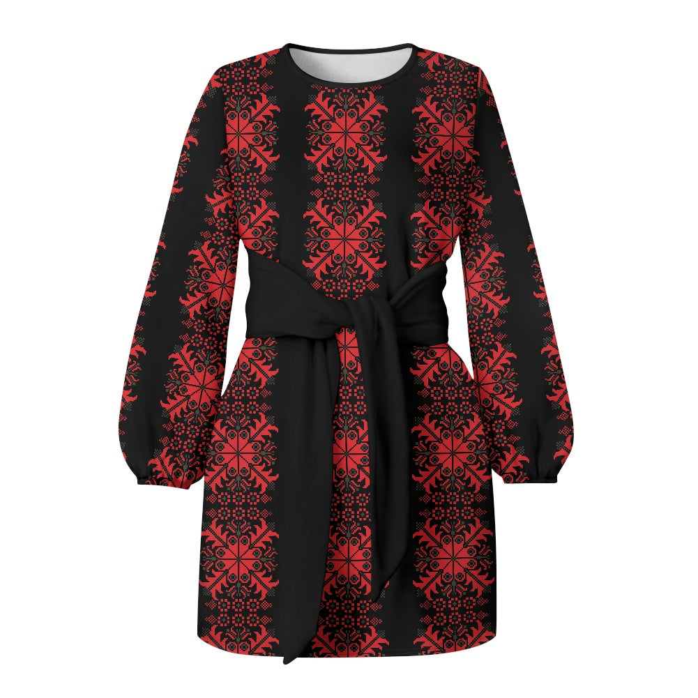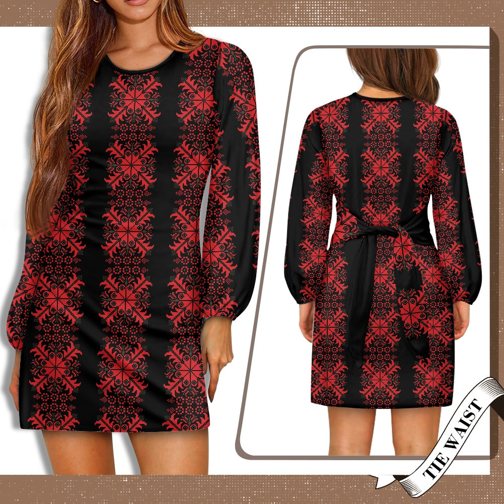 Gaza Tatreez Print Waist Long Sleeve Tie Dress