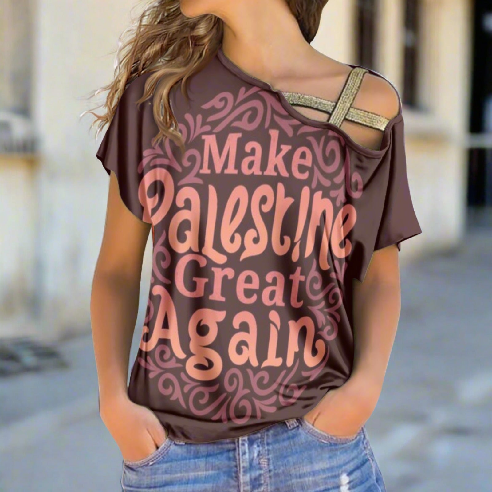 Make a bold statement with our Stylish Palestinian Women's Top featuring the empowering slogan "Make Palestine Great Again." This top blends modern fashion with cultural pride, offering a meaningful expression of support for Palestine. Crafted from high-quality materials, it ensures comfort and durability while making a powerful statement.