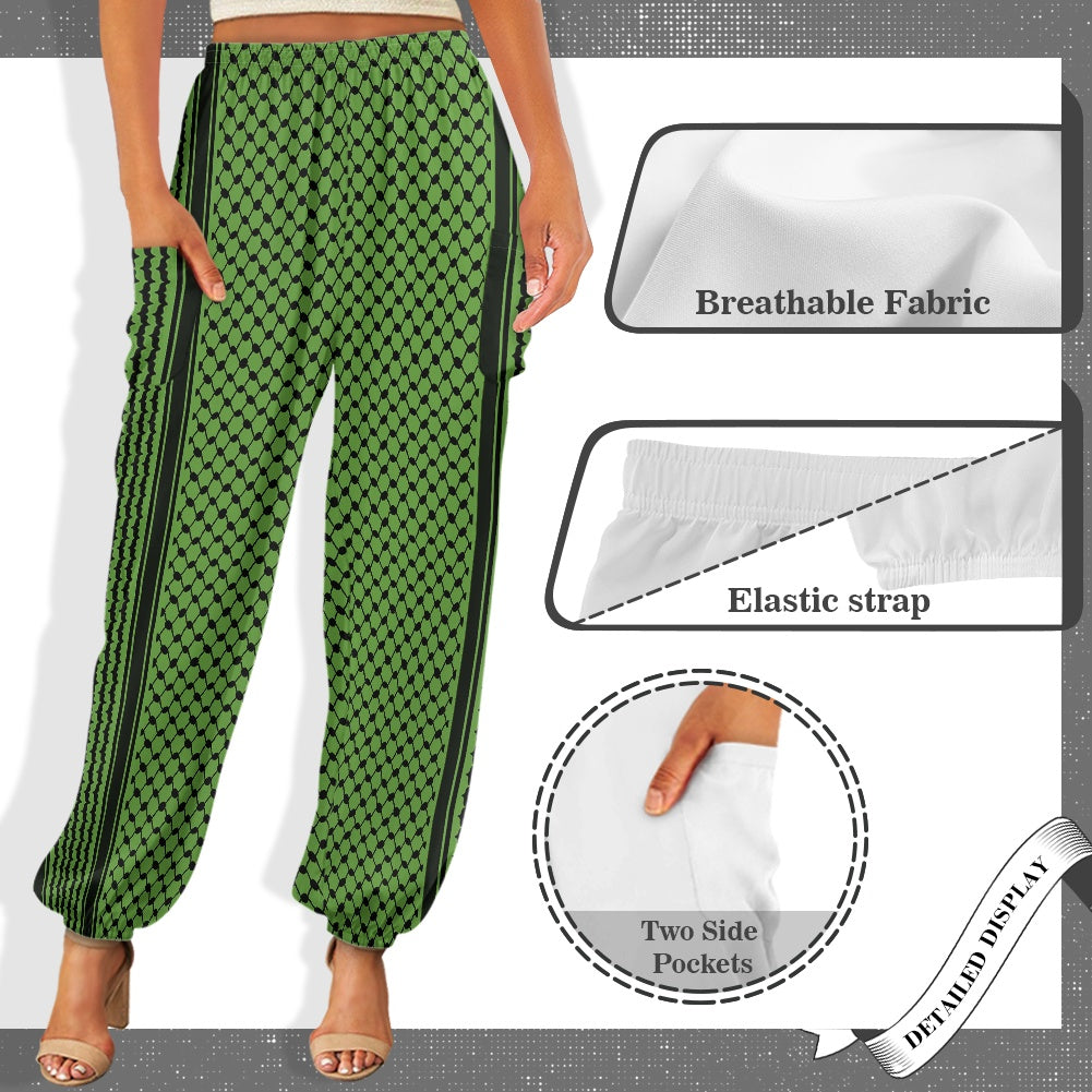 Embrace comfort and tradition with the Women's Bloomer Kuffiyeh Print Green Yoga Pants from Tatreez Bazaar—where cultural heritage meets contemporary style