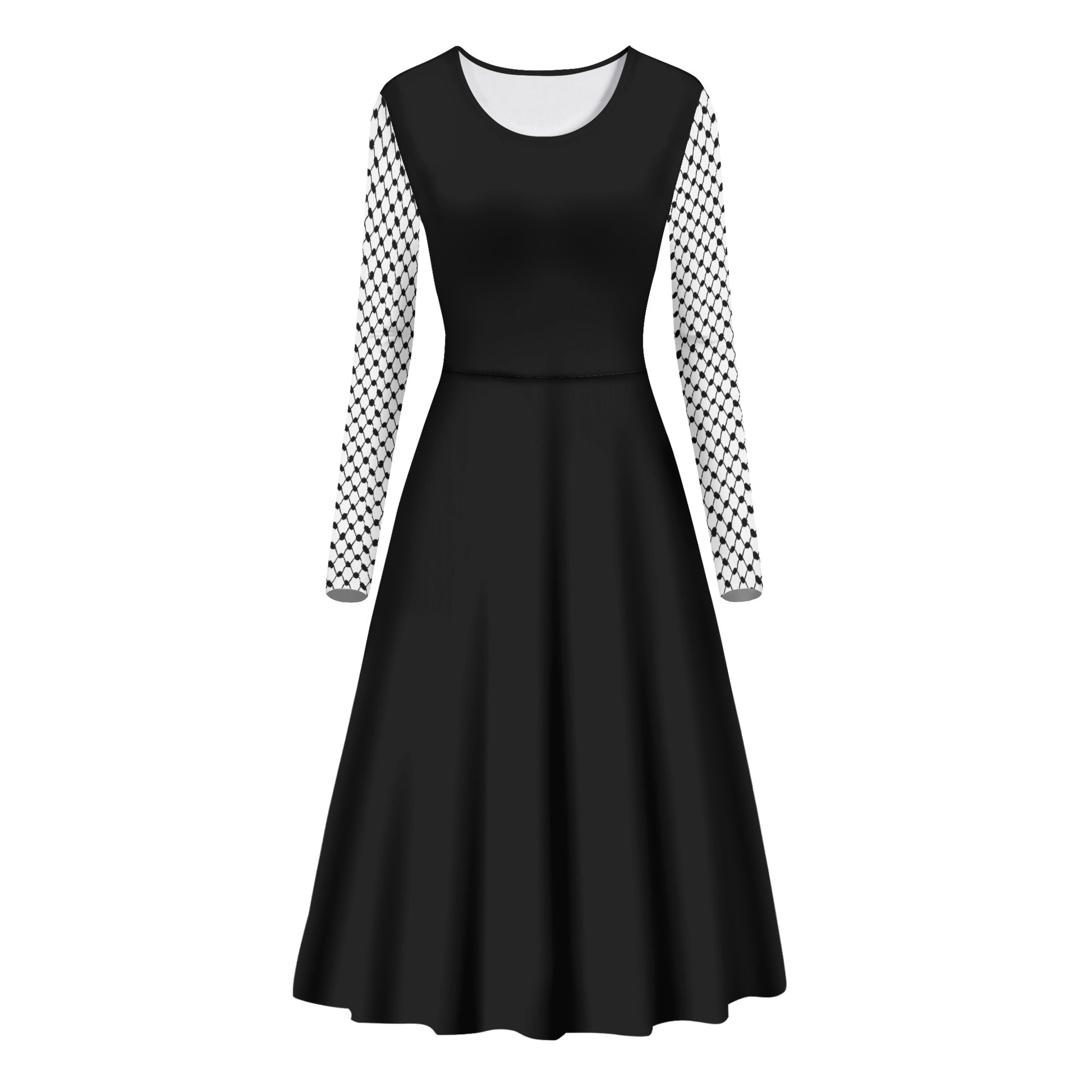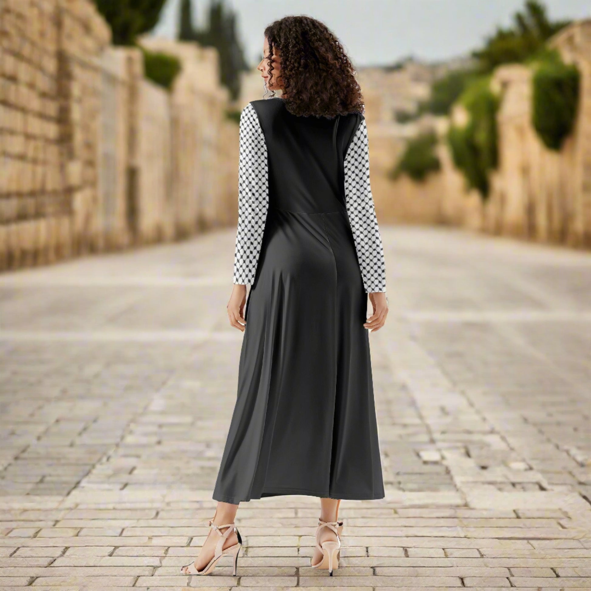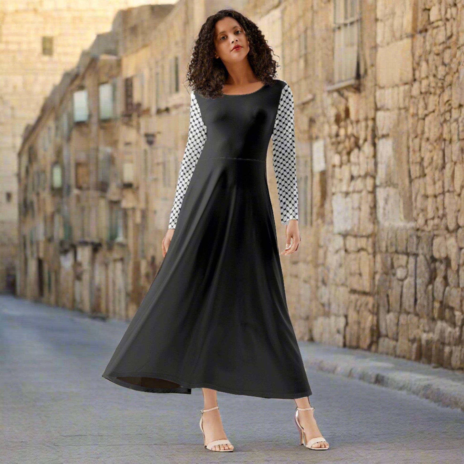 This long dress features a classic round neck style, complemented by long sleeves that add an elegant touch to the overall look. The length of the dress covers the knee, making it a perfect choice for a party or any special occasion where you want to make a lasting impression. The soft and elastic fabric ensures a comfortable fit, allowing you to move with ease and grace. The unique Palestinian kufiyeh pattern on the sleeves brings an artistic flair to the dress, showcasing a blend of traditional and contemporary design elements.