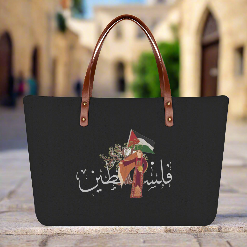 Measuring at a convenient size, this tote bag is not only a stylish accessory but also a testament to your unique taste. The blend of durability and elegance is reflected in its quality construction and the thoughtful incorporation of cultural elements. To keep your tote looking its best, simply wipe it with a damp cloth if it gets dirty. With its unique design and functional features, this Palestinian Woman Tote Bag is not just a bag; it's a statement of identity and a nod to craftsmanship that resonates with the authenticity that Tatreez Bazaar stands for. Embrace your love for Palestine and carry a piece of its soul with you every day. Add this tote to your collection and let your accessories tell a story of heritage and pride.