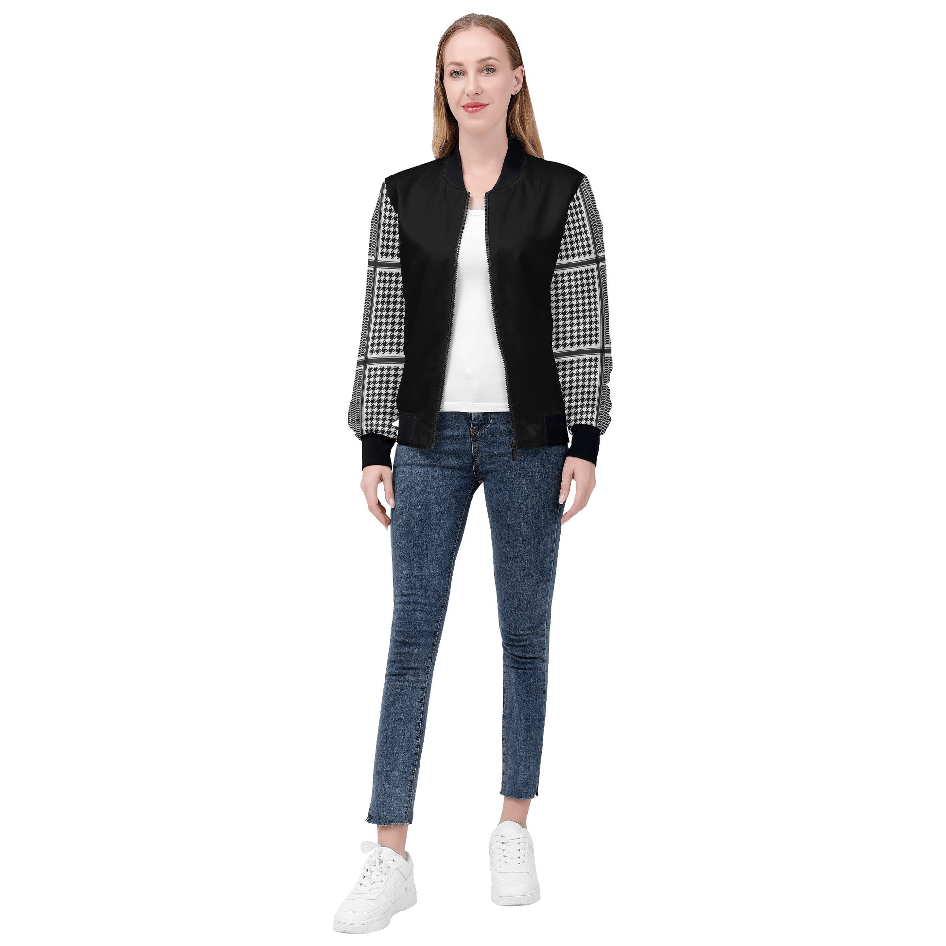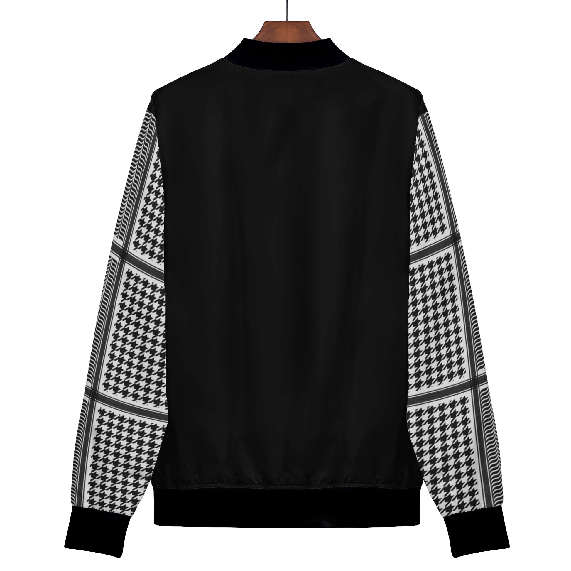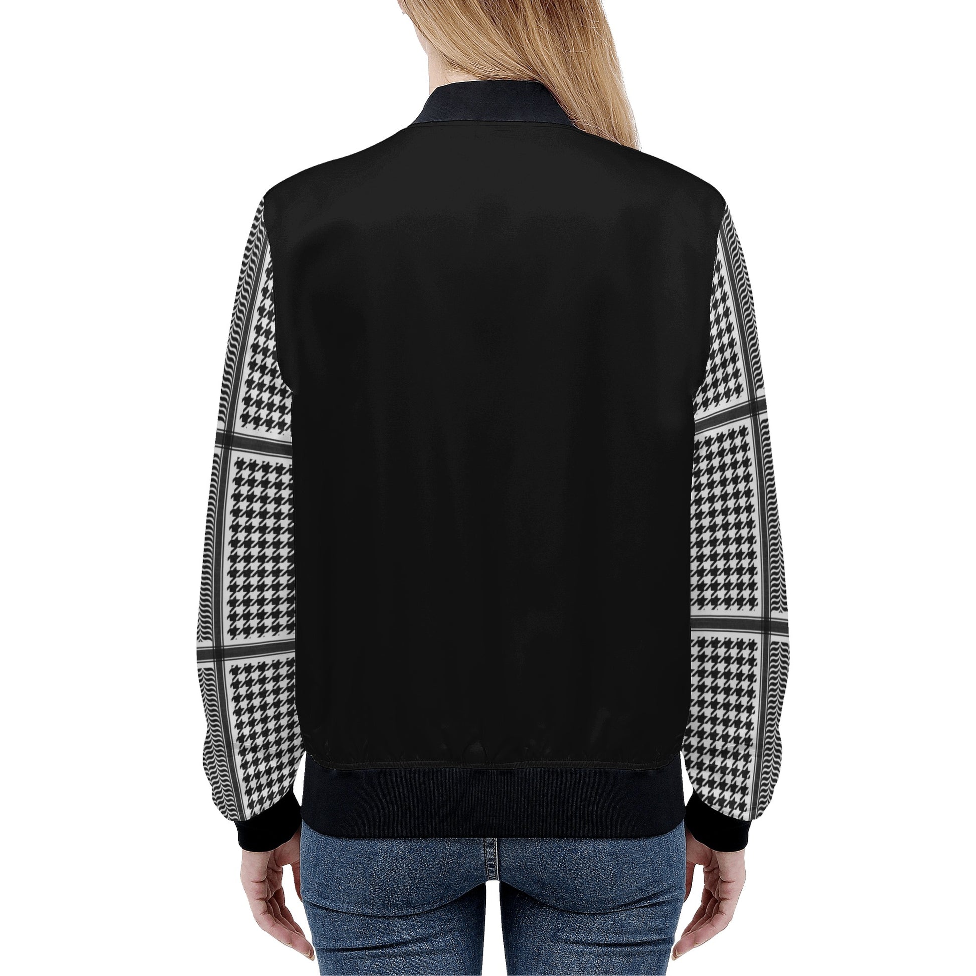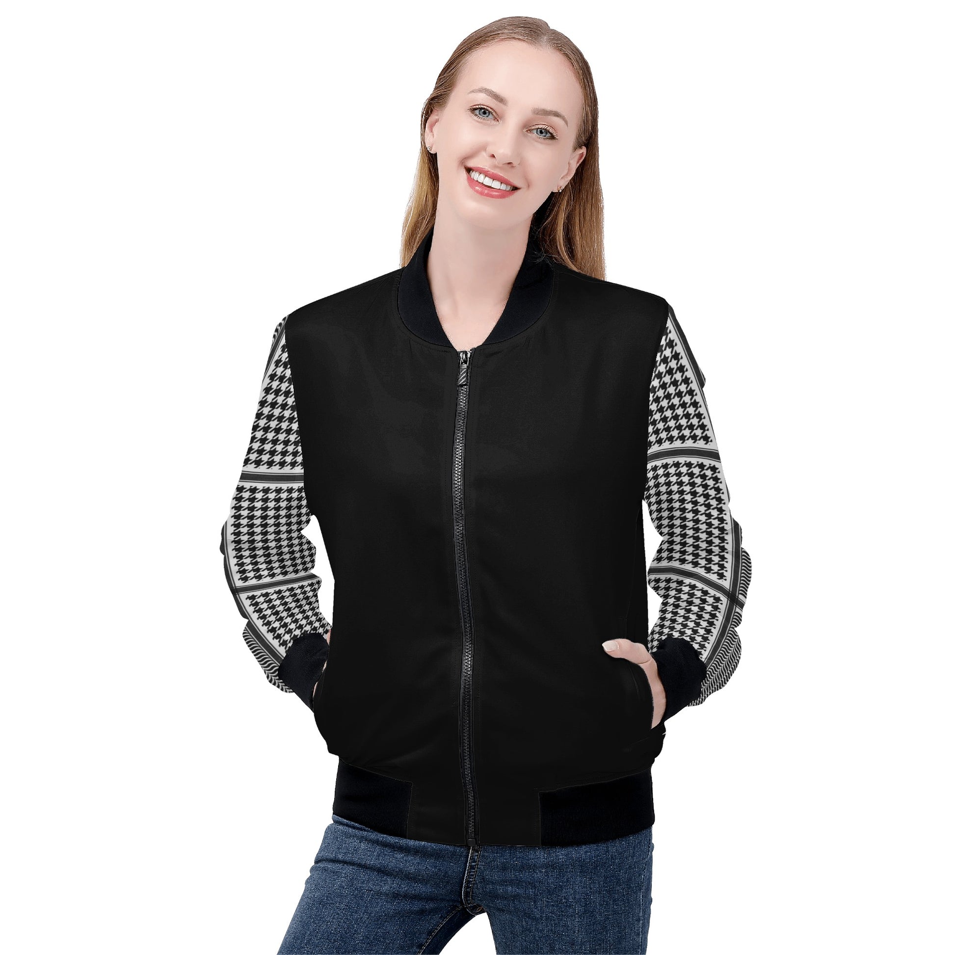 Women's Bomber Jacket in Black, Chic Houndstooth Kufiyeh Sleeve Pattern, Unique Gift for Her.